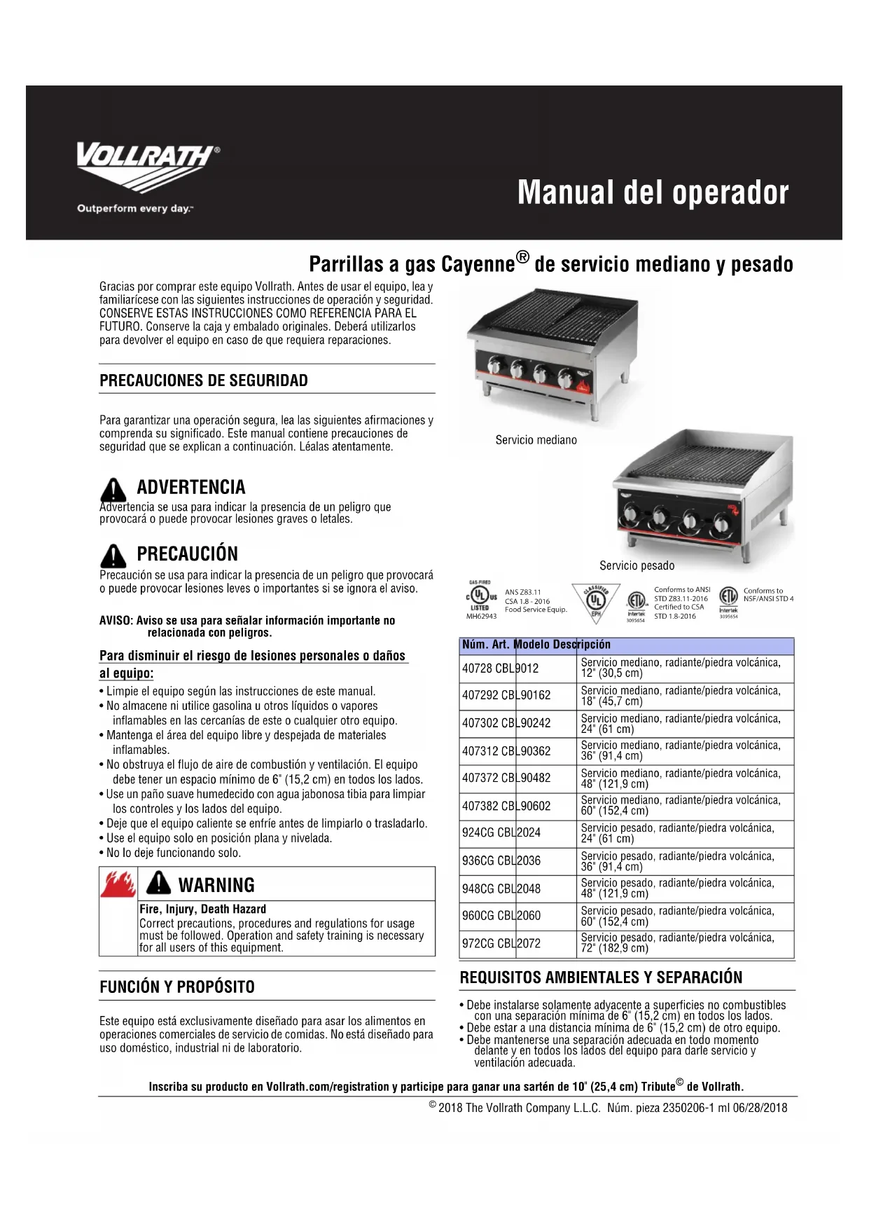 - Debe instalarse solamente adyacente a superficies no combustibles con una separación mínima de 6" (15,2 cm) en todos los lados. • Debe estar a una distancia mínima de 6" (15,2 cm) de otro equipo. • Debe mantenerse una separación adecuada en todo momento delante y en todos los lados del equipo para darle servicio y ventilación adecuada. ADVERTENCIA PRECAUCIÓN WARNING Fire, Injury, Death HazardCorrect precautions, procedures and regulations for usage must be followed. Operation and safety training is necessary for all users of this equipment. Núm. Art. Modelo Descripción40728 CBL9012Servicio mediano, radiante/piedra volcánica, 12" (30,5 cm)407292 CBL90162Servicio mediano, radiante/piedra volcánica, 18" (45,7 cm)407302 CBL90242Servicio mediano, radiante/piedra volcánica, 24" (61 cm)407312 CBL90362Servicio mediano, radiante/piedra volcánica, 36" (91,4 cm)407372 CBL90482Servicio mediano, radiante/piedra volcánica, 48" (121,9 cm)407382 CBL90602Servicio mediano, radiante/piedra volcánica, 60" (152,4 cm)924CG CBL2024Servicio pesado, radiante/piedra volcánica, 24" (61 cm)936CG CBL2036Servicio pesado, radiante/piedra volcánica, 36" (91,4 cm)948CG CBL2048Servicio pesado, radiante/piedra volcánica, 48" (121,9 cm)960CG CBL2060Servicio pesado, radiante/piedra volcánica, 60" (152,4 cm)972CG CBL2072Servicio pesado, radiante/piedra volcánica, 72" (182,9 cm) Servicio pesadoServicio mediano ANS Z83.11CSA 1.8 - 2016Food Service Equip.MH62943 Conforms to ANSI STD Z83.11-2016Certied to CSA STD 1.8-2016