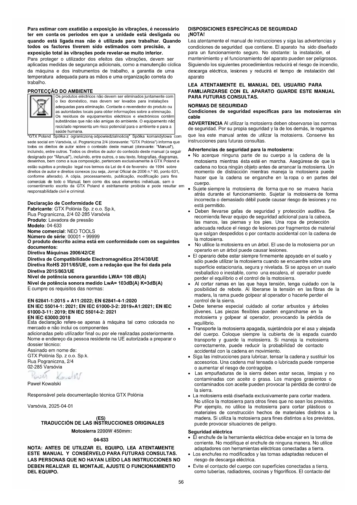 Los productos accionados eléctricamente no deben desecharse con la basura doméstica, sino que deben llevarse a instalaciones adecuadas para su eliminación. Póngase en contacto con el distribuidor del producto o con las autoridades locales para obtener información sobre su eliminación. Los residuos de aparatos eléctricos y electrónicos contienen sustancias nocivas para el medio ambiente. Los equipos no reciclados suponen un riesgo potencial para el medio ambiente y la salud humana. "GTX Polonia Spółka z ograniczoną odpowiedzialnością" Spółka komandytowa con domicilio social en Varsovia, ul. Pograniczna 2/4 (en adelante: "GTX Polonia ") informa que todos los derechos de autor sobre el contenido de este manual (en adelante: "Manual"), incluyendo entre otros. Todos los derechos de autor sobre el contenido de este Manual (en adelante: "Manual"), incluyendo entre otros su texto, fotografías, diagramas, dibujos, así como su composición, pertenecen exclusivamente a GTX Polonia y están sujetos a protección legal de conformidad con la Ley de 4 de febrero de 1994 sobre Derechos de Autor y Derechos Conexos (es decir, Diario de Leyes 2006 N º 90 Tema 631 en su versión modificada). La copia, el procesamiento, la publicación y la modificación con fines comerciales de todo el Manual, así como de sus elementos individuales, sin el consentimiento por escrito de GTX Polonia están estrictamente prohibidos y pueden dar lugar a responsabilidades civiles y penales. Declaración de conformidad CE Fabricante: GTX Poland Sp. z o.o. Sp.k, Calle Pograniczna 2/4 02-285 Varsovia Producto: Hidrolimpiadora Modelo: 04-633 Nombre comercial: NEO TOOLS Número de serie: 00001 ÷ 99999 El producto descrito anteriormente cumple con los siguientes documentos: Directiva sobre máquinas 2006/42/CE Directiva de compatibilidad electromagnética 2014/30/UE59 Directiva RUSP 2011/65/UE modificada por la Directiva 2015/863/UE Nivel de potencia acústica garantizado LWA= 108 dB(A) Nivel de potencia acústica medido LwA= 103dB(A) K=3dB(A) Y cumple los requisitos de las normas: EN 62841-1:2015 + A11:2022; EN 62841-4-1:2020 EN IEC 55014-1: 2021; EN IEC 61000-3-2: 2019+A1:2021; EN IEC