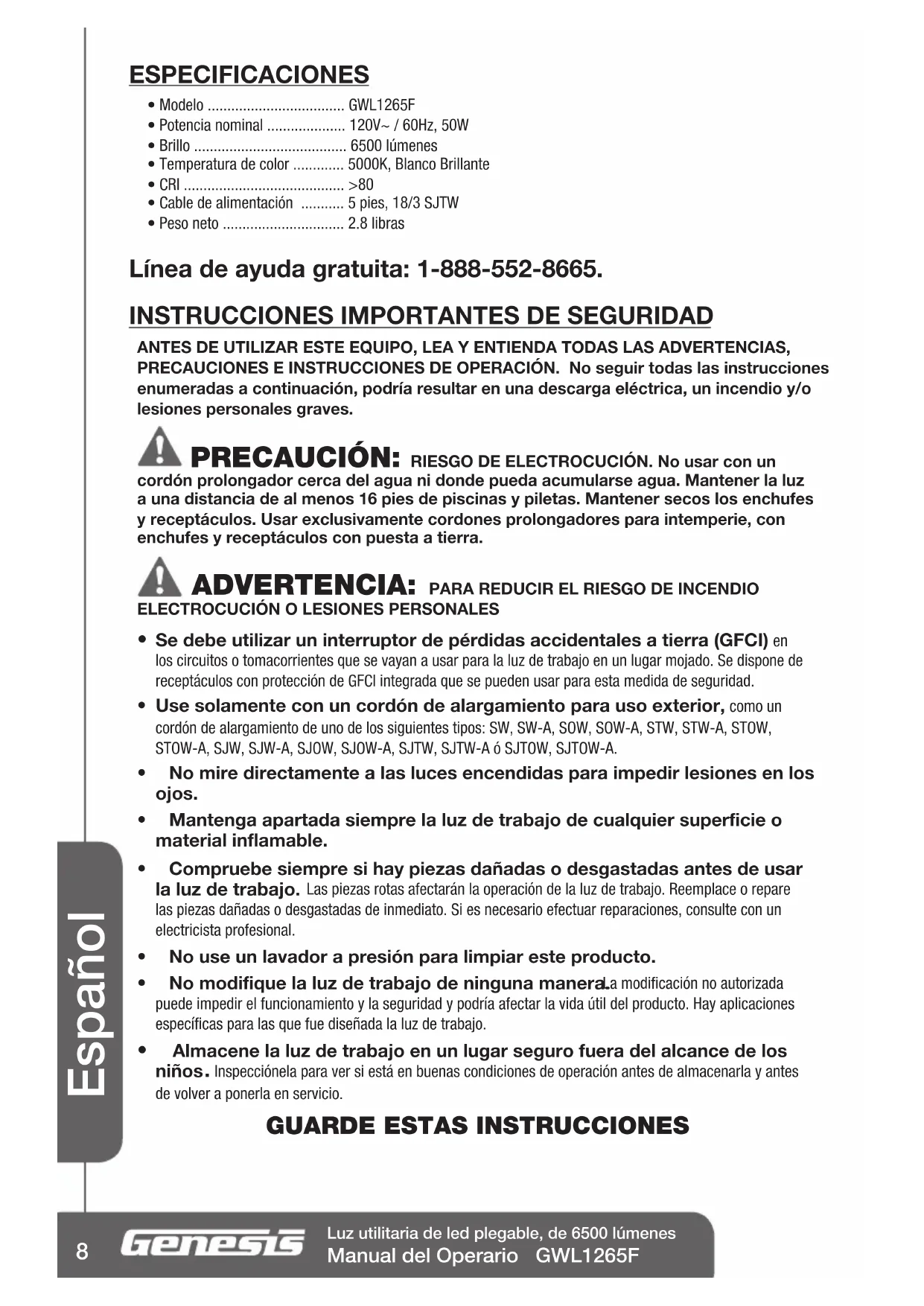 ANTES DE UTILIZAR ESTE EQUIPO, LEA Y ENTIENDA TODAS LAS ADVERTENCIAS, PRECAUCIONES E INSTRUCCIONES DE OPERACIÓN. No seguir todas las instrucciones enumeradas a continuación, podría resultar en una descarga eléctrica, un incendio y/o lesiones personales graves. PRECAUCIÓN: RIESGO DE ELECTROCUCIÓN. No usar con un cordón prolongador cerca del agua ni donde pueda acumularse agua. Mantener la luz a una distancia de al menos 16 pies de piscinas y piletas. Mantener secos los enchufes y receptáculos. Usar exclusivamente cordones prolongadores para intemperie, con enchufes y receptáculos con puesta a tierra. ADVERTENCIA: PARA REDUCIR EL RIESGO DE INCENDIO