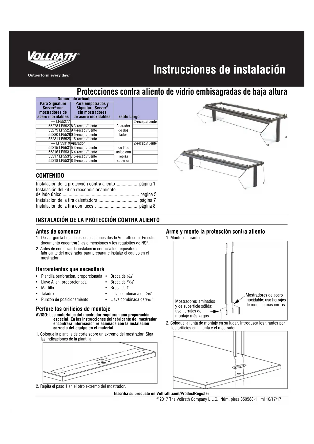 2017 The Vollrath Company L.L.C. Núm. pieza 350588-1 ml 10/17/17 Protecciones contra aliento de vidrio embisagradas de baja altura Inscriba su producto en Vollrath.com/ProductRegister CONTENIDO Instalación de la protección contra aliento .................. página 1 Instalación del kit de reacondicionamiento de lado único ............................................................... página 5 Instalación de la tira calentadora ................................. página 7 Instalación de la tira con luces .................................... página 8 INSTALACIÓN DE LA PROTECCIÓN CONTRA ALIENTO Antes de comenzar