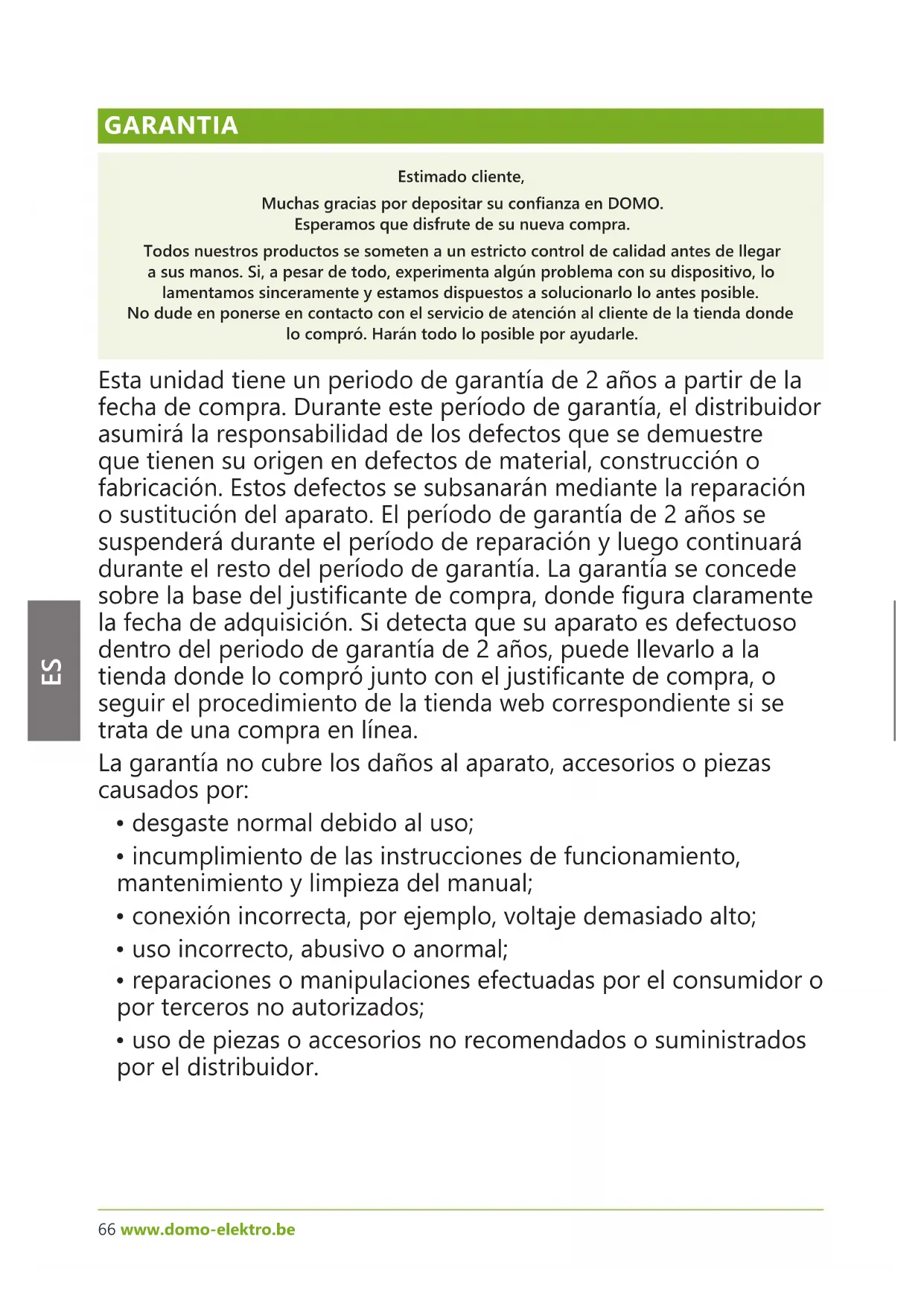 GARANTIA Estimado cliente, Muchas gracias por depositar su conanza en DOMO. Esperamos que disfrute de su nueva compra. Todos nuestros productos se someten a un estricto control de calidad antes de llegar a sus manos. Si, a pesar de todo, experimenta algún problema con su dispositivo, lo lamentamos sinceramente y estamos dispuestos a solucionarlo lo antes posible. No dude en ponerse en contacto con el servicio de atención al cliente de la tienda donde lo compró. Harán todo lo posible por ayudarle. Esta unidad tiene un periodo de garantía de 2 años a partir de la fecha de compra. Durante este período de garantía, el distribuidor asumirá la responsabilidad de los defectos que se demuestre que tienen su origen en defectos de material, construcción o fabricación. Estos defectos se subsanarán mediante la reparación o sustitución del aparato. El período de garantía de 2 años se suspenderá durante el período de reparación y luego continuará durante el resto del período de garantía. La garantía se concede sobre la base del justicante de compra, donde gura claramente la fecha de adquisición. Si detecta que su aparato es defectuoso dentro del periodo de garantía de 2 años, puede llevarlo a la tienda donde lo compró junto con el justicante de compra, o seguir el procedimiento de la tienda web correspondiente si se trata de una compra en línea. La garantía no cubre los daños al aparato, accesorios o piezas causados por: