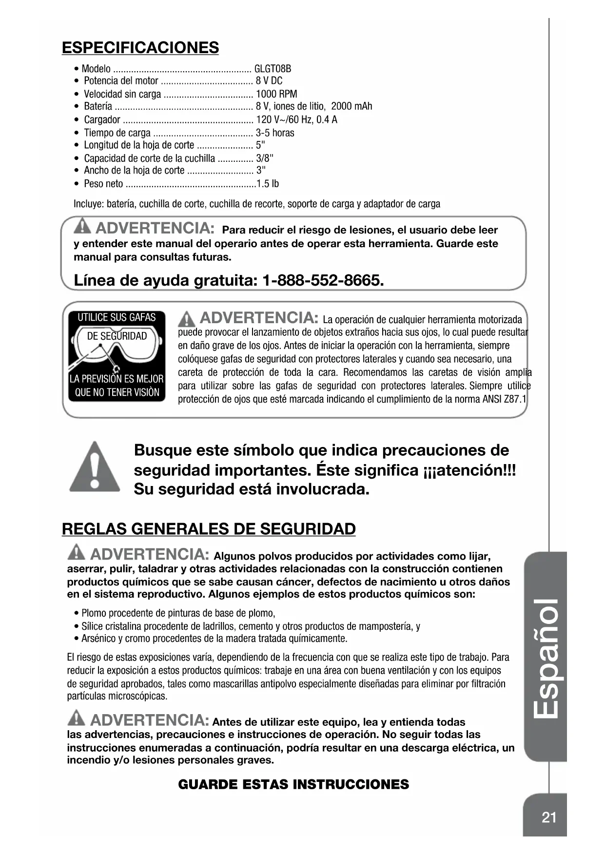 - Modelo ...................................................... GLGT08B• Potencia del motor .................................... 8 V DC• Velocidad sin carga ................................... 1000 RPM• Batería ...................................................... 8 V, iones de litio, 2000 mAh• Cargador ................................................... 120 V~/60 Hz, 0.4 A• Tiempo de carga ....................................... 3-5 horas• Longitud de la hoja de corte ...................... 5"• Capacidad de corte de la cuchilla .............. 3/8"• Ancho de la hoja de corte .......................... 3"• Peso neto ...................................................1.5 lbIncluye: batería, cuchilla de corte, cuchilla de recorte, soporte de carga y adaptador de carga ADVERTENCIA: Para reducir el riesgo de lesiones, el usuario debe leer y entender este manual del operario antes de operar esta herramienta. Guarde este manual para consultas futuras. Línea de ayuda gratuita: 1-888-552-8665. ADVERTENCIA: La operación de cualquier herramienta motorizada puede provocar el lanzamiento de objetos extraños hacia sus ojos, lo cual puede resultar en daño grave de los ojos. Antes de iniciar la operación con la herramienta, siempre colóquese gafas de seguridad con protectores laterales y cuando sea necesario, una careta de protección de toda la cara. Recomendamos las caretas de visión amplia para utilizar sobre las gafas de seguridad con protectores laterales. Siempre utilice protección de ojos que esté marcada indicando el cumplimiento de la norma ANSI Z87.1 Busque este símbolo que indica precauciones de seguridad importantes. Éste significa ¡¡¡atención!!! Su seguridad está involucrada.