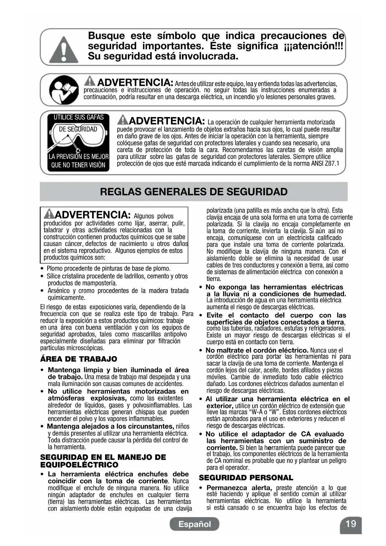 DE SEGURIDAD ADVERTENCIA: La operación de cualquier herramienta motorizada puede provocar el lanzamiento de objetos extraños hacia sus ojos, lo cual puede resultar en daño grave de los ojos. Antes de iniciar la operación con la herramienta, siempre colóquese gafas de seguridad con protectores laterales y cuando sea necesario, una careta de protección de toda la cara. Recomendamos las caretas de visión amplia para utilizar sobre las gafas de seguridad con protectores laterales. Siempre utilice protección de ojos que esté marcada indicando el cumplimiento de la norma ANSI Z87.1 ADVERTENCIA: Antes de utilizar este equipo, lea y entienda todas las advertencias, precauciones e instrucciones de operación. no seguir todas las instrucciones enumeradas a continuación, podría resultar en una descarga eléctrica, un incendio y/o lesiones personales graves.