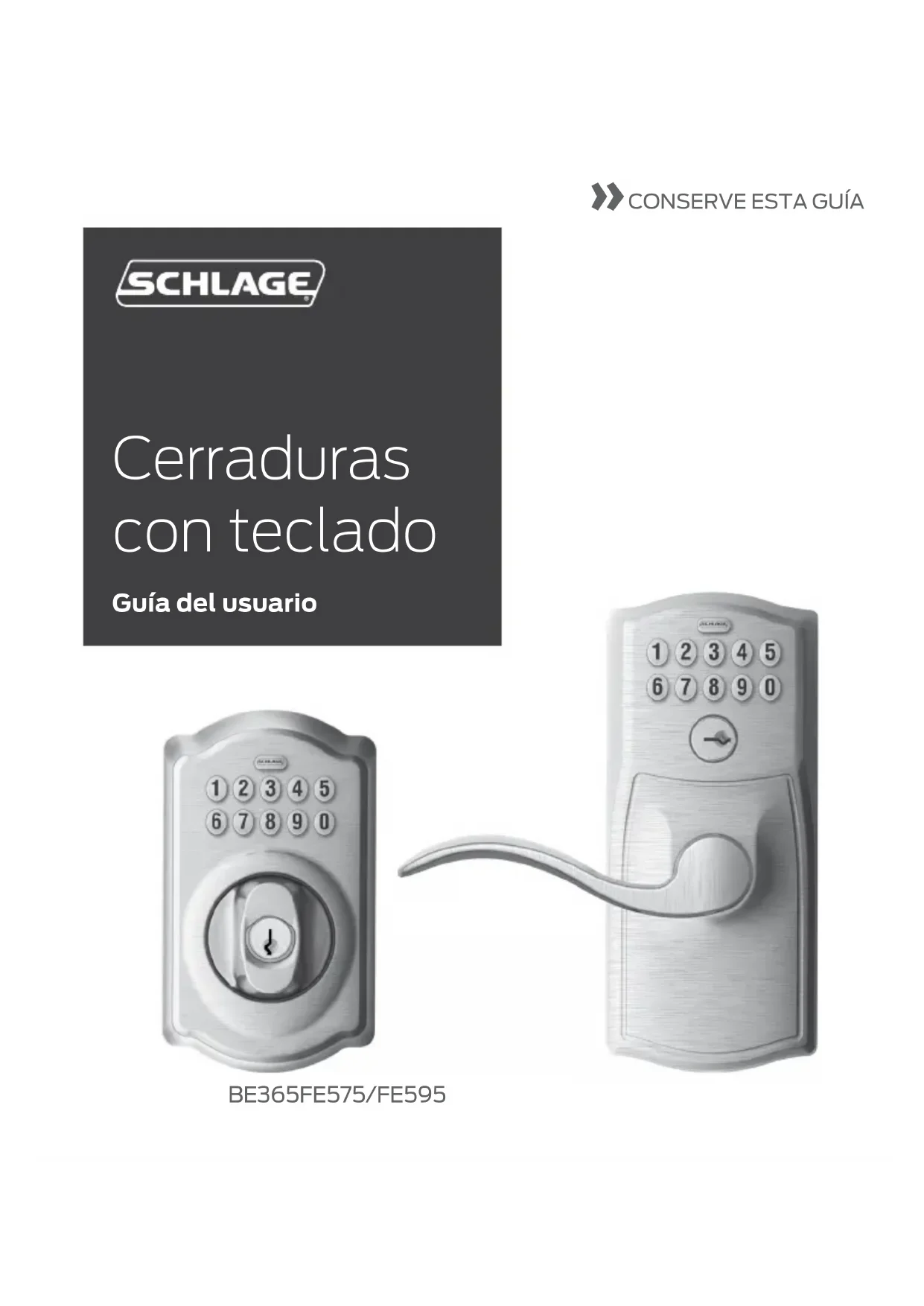 - Acceda a answers.schlage.com y haga clic en Electronic Locks en el menú de la derecha para acceder a videos, resolución de problemas, preguntas frecuentes y más. ¿Tiene alguna pregunta sobre su nueva cerradura con teclado? ¡No la devuelva a la tienda! ¡Permítanos ayudarle primero! Garantía LimitadaGarantía limitada de por vida sobre las piezas mecánicas y el acabado, y garantía limitada de tres años sobre los componentes electrónicos En virtud de los términos y condiciones de esta garantía, Schlage extiende una garantía limitada de por vida sobre las piezas mecánicas y el acabado, así como una garantía limitada de tres años sobre los componentes electrónicos, al usuario consumidor original (“Usuario original”) de nuestro producto Schlage (“Producto”) contra defectos en los materiales y la fabricación, siempre que el Usuario original habite la residencia en donde se instaló originalmente el Producto. Consulte answers.schlage.com para ver información y limitaciones especícas de la garantía, o comuníquese con el Servicio de Asistencia al Cliente de Schlage llamando al (888) 805-9837 en los EE. UU. y Canadá o (800) 506-7866 en México para obtener ayuda. Cerraduras con teclado Guía del usuario ContenidoRegistre su productoDocumente su compra y registre su garantía en RegisterMySchlage.comGarantía Limitada p. 18