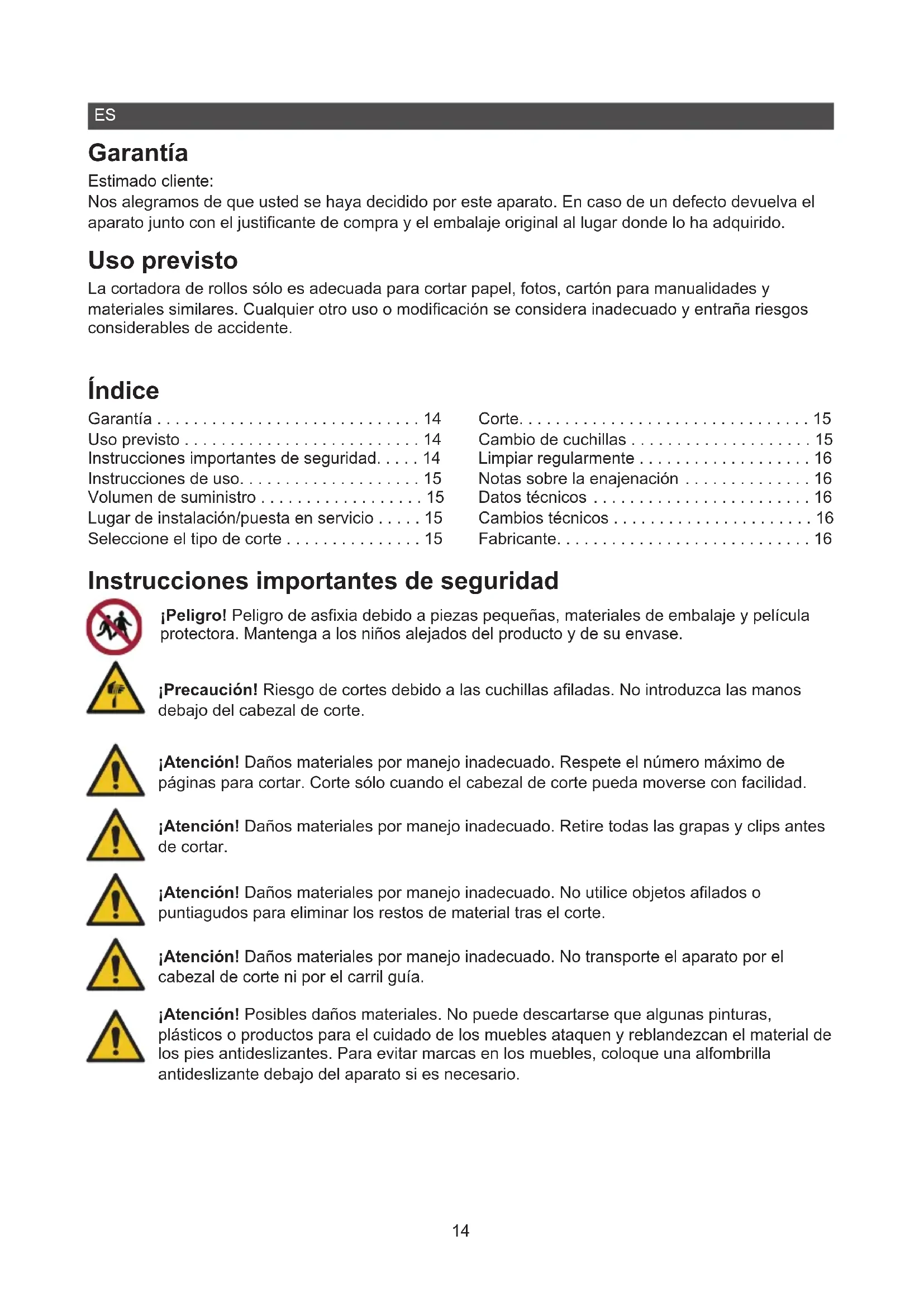 - Fabricante Instrucciones importantes de seguridad ¡Peligro! Peligro de asxia debido a piezas pequeñas, materiales de embalaje y película protectora. Mantenga a los niños alejados del producto y de su envase. ¡Precaución! Riesgo de cortes debido a las cuchillas aladas. No introduzca las manos debajo del cabezal de corte. ¡Atención! Daños materiales por manejo inadecuado. Respete el número máximo de páginas para cortar. Corte sólo cuando el cabezal de corte pueda moverse con facilidad. ¡Atención! Daños materiales por manejo inadecuado. Retire todas las grapas y clips antes de cortar. ¡Atención! Daños materiales por manejo inadecuado. No utilice objetos alados o puntiagudos para eliminar los restos de material tras el corte. ¡Atención! Daños materiales por manejo inadecuado. No transporte el aparato por el cabezal de corte ni por el carril guía. ¡Atención! Posibles daños materiales. No puede descartarse que algunas pinturas, plásticos o productos para el cuidado de los muebles ataquen y reblandezcan el material de los pies antideslizantes. Para evitar marcas en los muebles, coloque una alfombrilla antideslizante debajo del aparato si es necesario.15 Instrucciones de uso Antes de usar el producto, por favor lea este manual de instrucciones. Conserve este manual de instrucciones para futuras consultas. Entregue todos los documentos cuando ceda el producto a terceros. p. 16