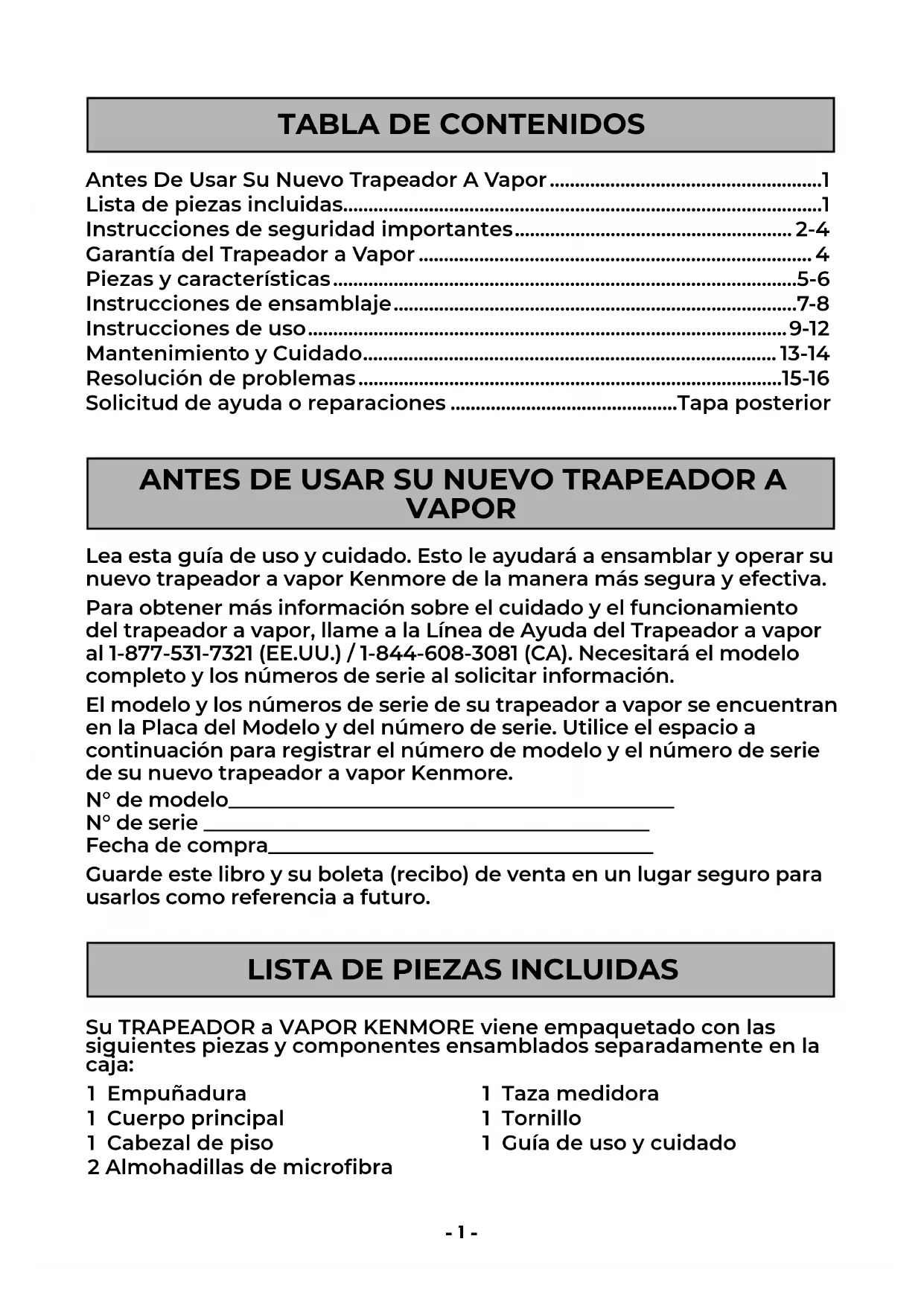 Su TRAPEADOR a VAPOR KENMORE viene empaquetado con las siguientes piezas y componentes ensamblados separadamente en la caja: 1 Empuñadura 1 Cuerpo principal 1 Cabezal de piso 2 Almohadillas de microbra Lea esta guía de uso y cuidado. Esto le ayudará a ensamblar y operar su nuevo trapeador a vapor Kenmore de la manera más segura y efectiva. Para obtener más información sobre el cuidado y el funcionamiento del trapeador a vapor, llame a la Línea de Ayuda del Trapeador a vapor al 1-877-531-7321 (EE.UU.) / 1-844-608-3081 (CA). Necesitará el modelo completo y los números de serie al solicitar información. El modelo y los números de serie de su trapeador a vapor se encuentran en la Placa del Modelo y del número de serie. Utilice el espacio a continuación para registrar el número de modelo y el número de serie de su nuevo trapeador a vapor Kenmore. N° de modelo____________________________________________ N° de serie ____________________________________________ Fecha de compra______________________________________ Guarde este libro y su boleta (recibo) de venta en un lugar seguro para usarlos como referencia a futuro. ANTES DE USAR SU NUEVO TRAPEADOR A VAPOR 1 Taza medidora 1 Tornillo 1 Guía de uso y cuidado- 2 - ¡ADVERTENCIA! Su seguridad es importante para nosotros. Para reducir el riesgo de incendio, descarga eléctrica, lesiones a personas o daños al usar su trapeador a vapor, siga las precauciones básicas de seguridad, incluidas las siguientes: