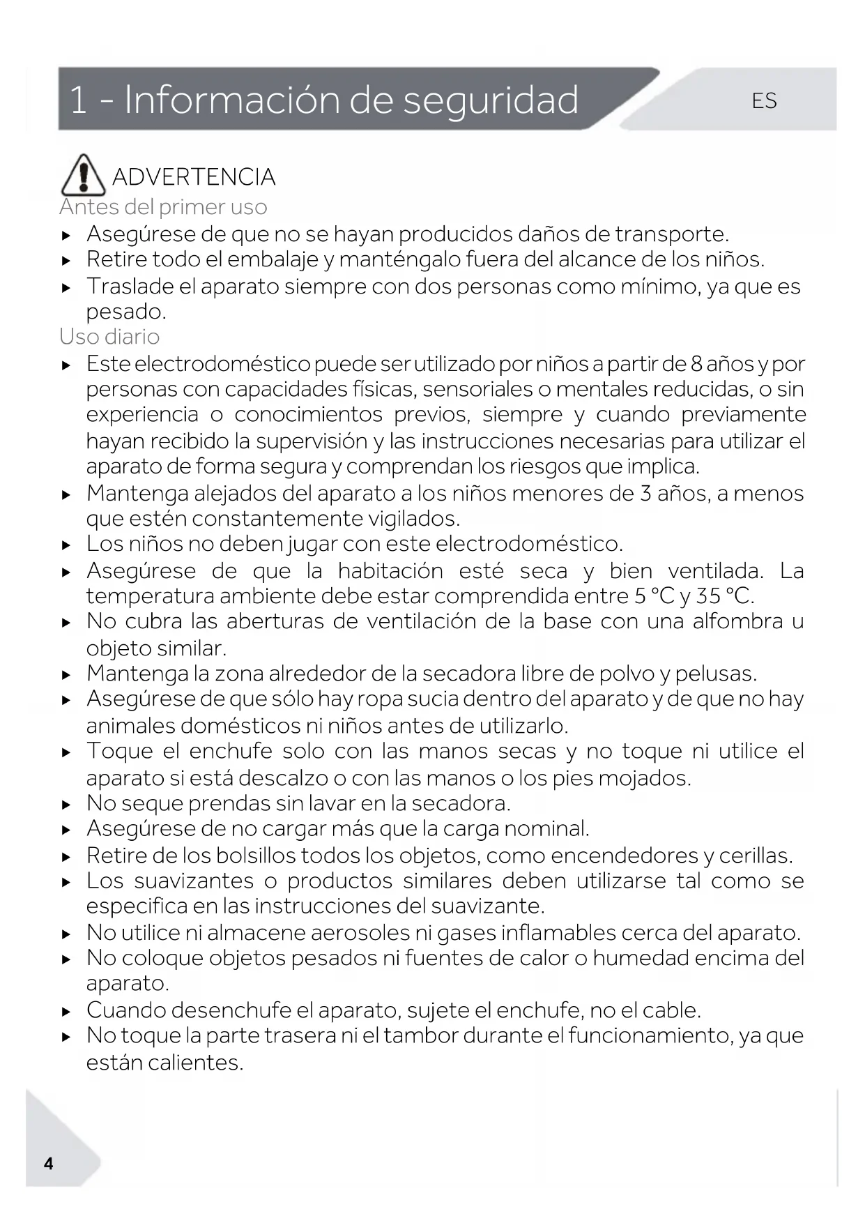 ADVERTENCIA Antes del primer uso Asegúrese de que no se hayan producidos daños de transporte. Retire todo el embalaje y manténgalo fuera del alcance de los niños. Traslade el aparato siempre con dos personas como mínimo, ya que es pesado. Uso diario Este electrodoméstico puede ser utilizado por niños a partir de 8 años y por personas con capacidades físicas, sensoriales o mentales reducidas, o sin experiencia o conocimientos previos, siempre y cuando previamente hayan recibido la supervisión y las instrucciones necesarias para utilizar el aparato de forma segura y comprendan los riesgos que implica. Mantenga alejados del aparato a los niños menores de 3 años, a menos que estén constantemente vigilados. Los niños no deben jugar con este electrodoméstico. Asegúrese de que la habitación esté seca y bien ventilada. La temperatura ambiente debe estar comprendida entre 5 °C y 35 °C. No cubra las aberturas de ventilación de la base con una alfombra u objeto similar. Mantenga la zona alrededor de la secadora libre de polvo y pelusas. Asegúrese de que sólo hay ropa sucia dentro del aparato y de que no hay animales domésticos ni niños antes de utilizarlo. Toque el enchufe solo con las manos secas y no toque ni utilice el aparato si está descalzo o con las manos o los pies mojados. No seque prendas sin lavar en la secadora. Asegúrese de no cargar más que la carga nominal. Retire de los bolsillos todos los objetos, como encendedores y cerillas. Los suavizantes o productos similares deben utilizarse tal como se especifica en las instrucciones del suavizante. No utilice ni almacene aerosoles ni gases inflamables cerca del aparato. No coloque objetos pesados ni fuentes de calor o humedad encima del aparato. Cuando desenchufe el aparato, sujete el enchufe, no el cable. No toque la parte trasera ni el tambor durante el funcionamiento, ya que están calientes.5