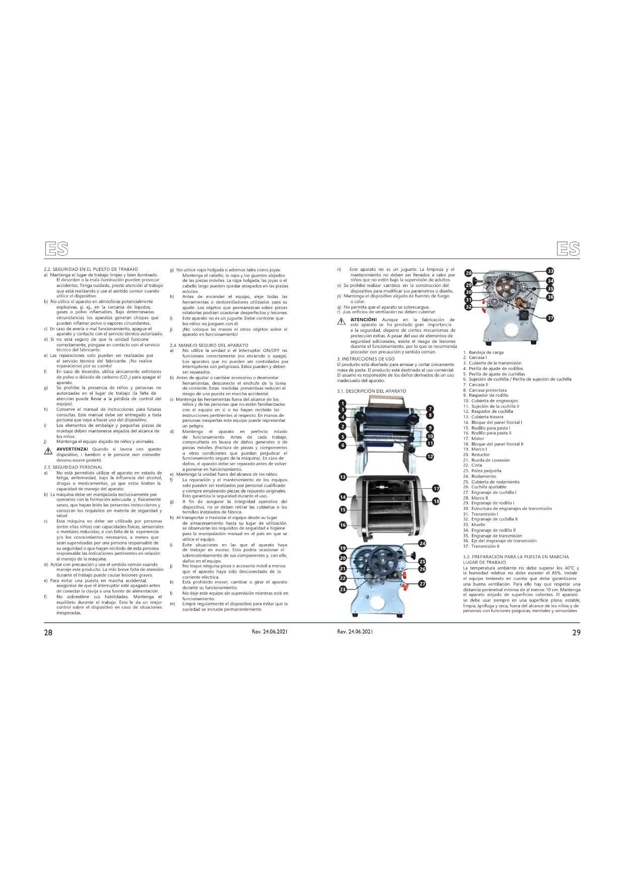 Rev. 24.06.2021 Rev. 24.06.20213. INSTRUCCIONES DE USO El producto está diseñado para amasar y cortar únicamente masa de pasta. El producto está destinado al uso comercial. El usuario es responsable de los daños derivados de un uso inadecuado del aparato.