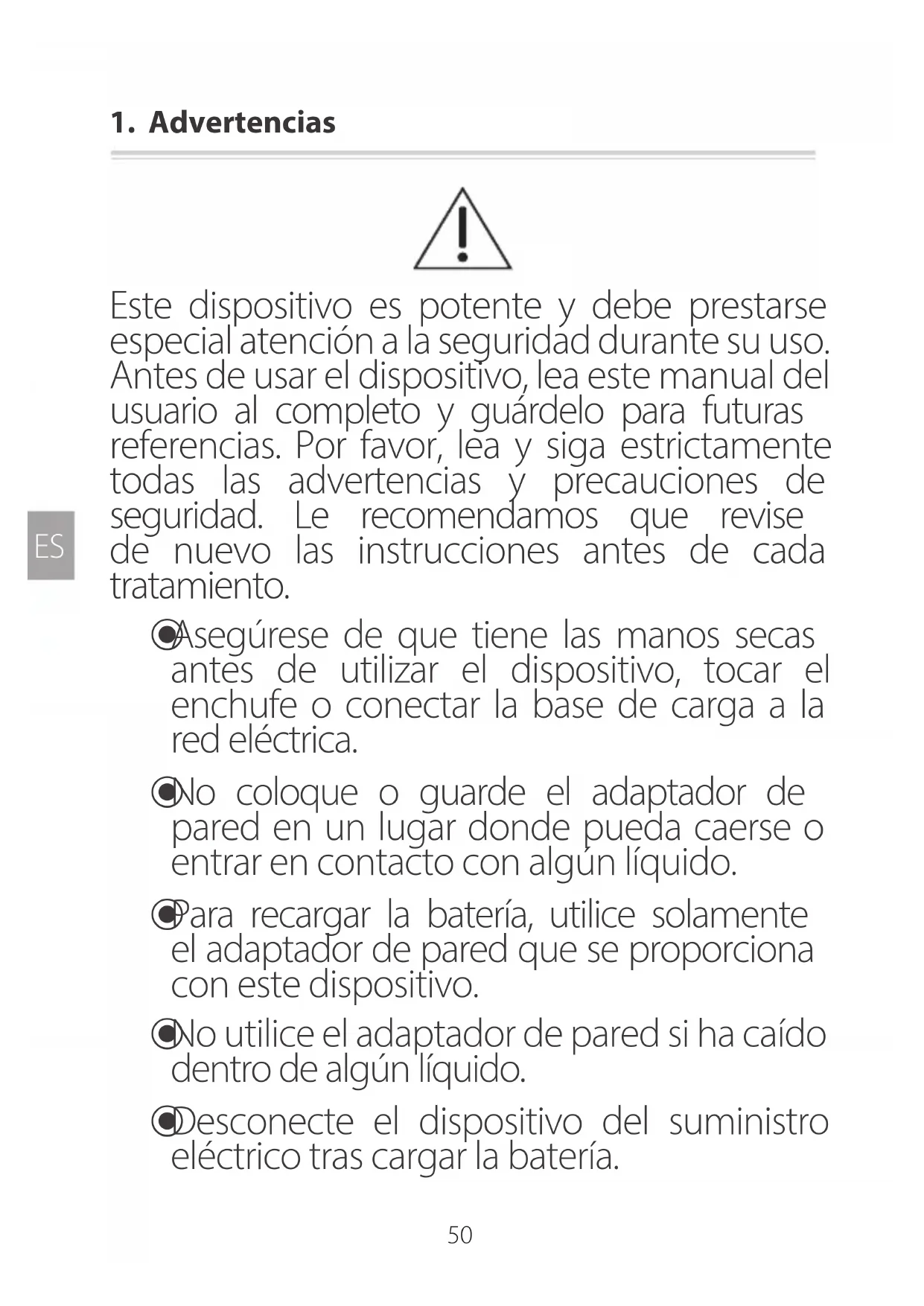 Este dispositivo es potente y debe prestarse especial atención a la seguridad durante su uso. Antes de usar el dispositivo, lea este manual del usuario al completo y guárdelo para futuras referencias. Por favor, lea y siga estrictamente todas las advertencias y precauciones de seguridad. Le recomendamos que revise de nuevo las instrucciones antes de cada tratamiento.