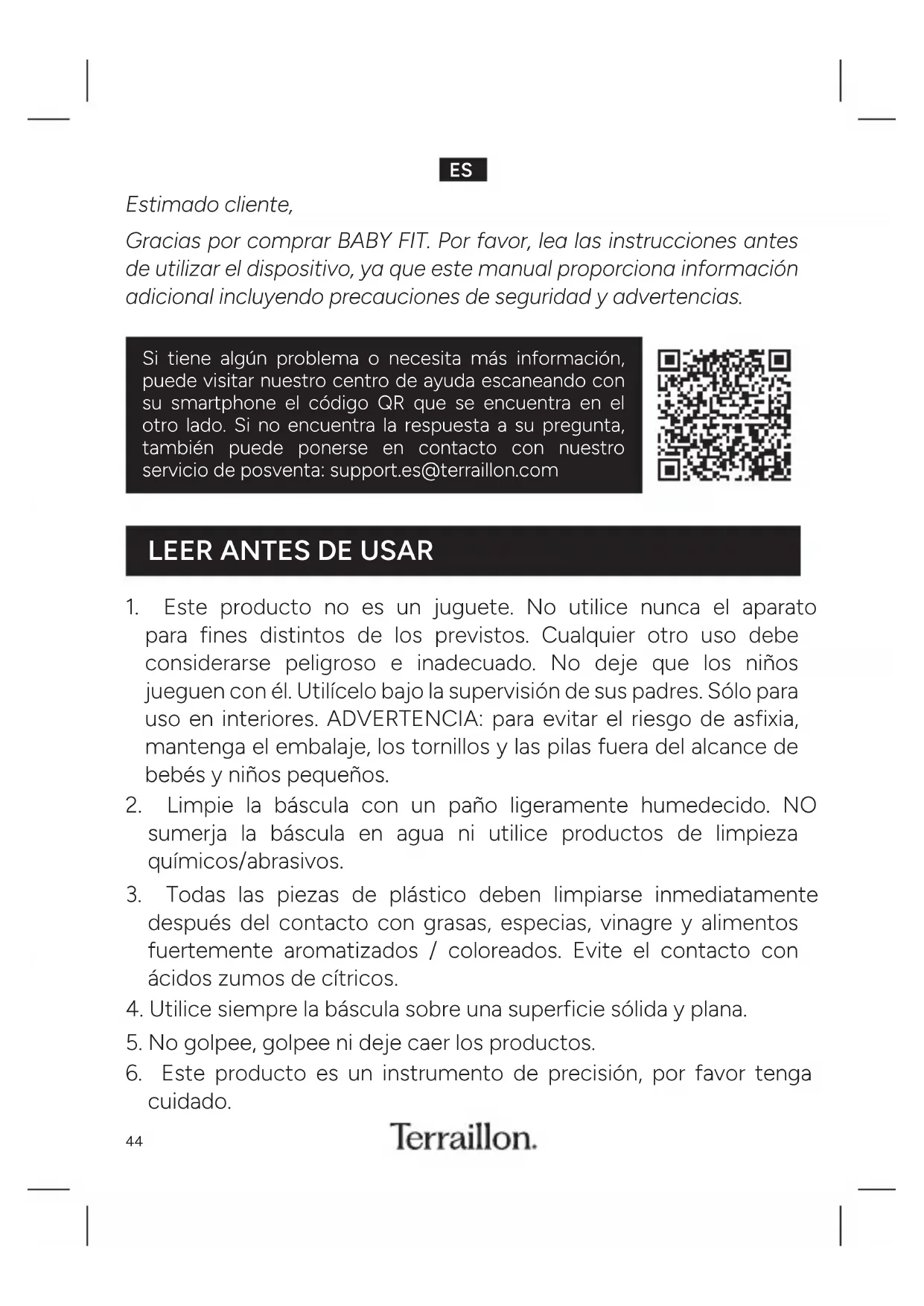 Estimado cliente, Gracias por comprar BABY FIT. Por favor, lea las instrucciones antes de utilizar el dispositivo, ya que este manual proporciona información adicional incluyendo precauciones de seguridad y advertencias. Si tiene algún problema o necesita más información, puede visitar nuestro centro de ayuda escaneando con su smartphone el código QR que se encuentra en el otro lado Si no encuentra la respuesta a su pregunta, también puede ponerse en contacto con nuestro servicio de posventa: supportes@terrailloncom