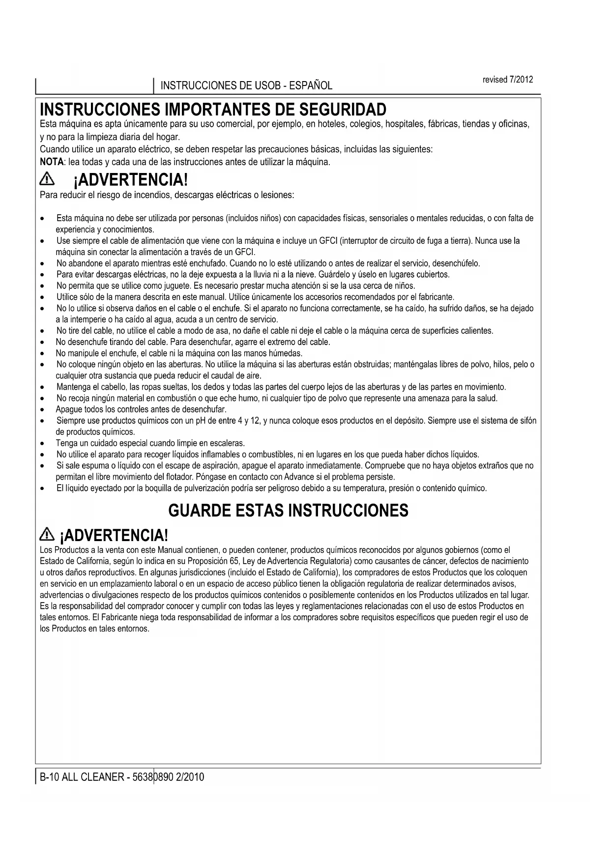 INSTRUCTIONS FOR USEA - ENGLISHINSTRUCCIONES IMPORTANTES DE SEGURIDAD Esta máquina es apta únicamente para su uso comercial, por ejemplo, en hoteles, colegios, hospitales, fábricas, tiendas y ofi cinas, y no para la limpieza diaria del hogar. Cuando utilice un aparato eléctrico, se deben respetar las precauciones básicas, incluidas las siguientes: NOTA: lea todas y cada una de las instrucciones antes de utilizar la máquina. ¡ADVERTENCIA! Para reducir el riesgo de incendios, descargas eléctricas o lesiones: Esta máquina no debe ser utilizada por personas (incluidos niños) con capacidades físicas, sensoriales o mentales reducidas, o con falta de experiencia y conocimientos. Use siempre el cable de alimentación que viene con la máquina e incluye un GFCI (interruptor de circuito de fuga a tierra). Nunca use la máquina sin conectar la alimentación a través de un GFCI. No abandone el aparato mientras esté enchufado. Cuando no lo esté utilizando o antes de realizar el servicio, desenchúfelo. Para evitar descargas eléctricas, no la deje expuesta a la lluvia ni a la nieve. Guárdelo y úselo en lugares cubiertos. No permita que se utilice como juguete. Es necesario prestar mucha atención si se la usa cerca de niños. Utilice sólo de la manera descrita en este manual. Utilice únicamente los accesorios recomendados por el fabricante. No lo utilice si observa daños en el cable o el enchufe. Si el aparato no funciona correctamente, se ha caído, ha sufrido daños, se ha dejado a la intemperie o ha caído al agua, acuda a un centro de servicio. No tire del cable, no utilice el cable a modo de asa, no dañe el cable ni deje el cable o la máquina cerca de superfi cies calientes. No desenchufe tirando del cable. Para desenchufar, agarre el extremo del cable. No manipule el enchufe, el cable ni la máquina con las manos húmedas. No coloque ningún objeto en las aberturas. No utilice la máquina si las aberturas están obstruidas; manténgalas libres de polvo, hilos, pelo o cualquier otra sustancia que pueda reducir el caudal de aire. Mantenga el cabello, las ropas sueltas, los dedos y todas las partes del cuerpo lejos de las aberturas y de las partes en movimiento. No recoja ningún material en combustión o que eche humo, ni cualquier tipo de polvo que represente una amenaza para la salud. Apague todos los controles antes de desenchufar. Siempre use productos químicos con un pH de entre 4 y 12, y nunca coloque esos productos en el depósito. Siempre use el sistema de sifón de productos químicos. Tenga un cuidado especial cuando limpie en escaleras. No utilice el aparato para recoger líquidos infl amables o combustibles, ni en lugares en los que pueda haber dichos líquidos. Si sale espuma o líquido con el escape de aspiración, apague el aparato inmediatamente. Compruebe que no haya objetos extraños que no permitan el libre movimiento del fl otador. Póngase en contacto con Advance si el problema persiste. El líquido eyectado por la boquilla de pulverización podría ser peligroso debido a su temperatura, presión o contenido químico.