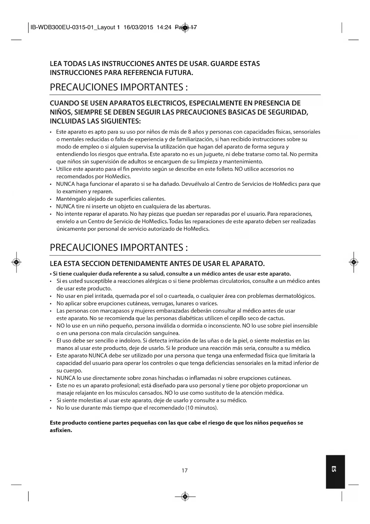 - No lo use durante más tiempo que el recomendado (10 minutos). Este producto contiene partes pequeñas con las que cabe el riesgo de que los niños pequeños se asfixien. IB-WDB300EU-0315-01_Layout 1 16/03/2015 14:24 Page 1718