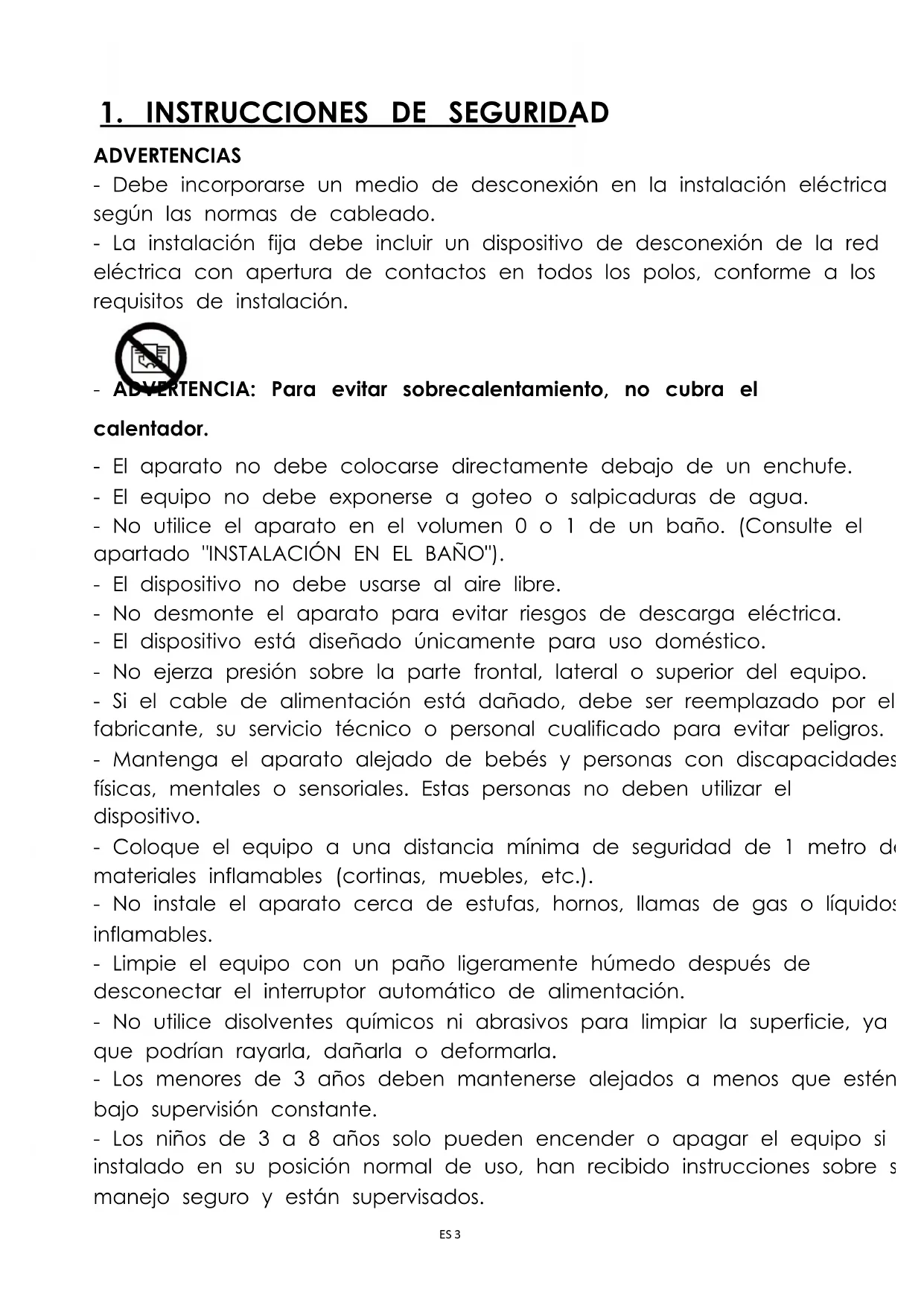 ADVERTENCIAS - Debe incorporarse un medio de desconexión en la instalación eléctrica según las normas de cableado. - La instalación fija debe incluir un dispositivo de desconexión de la red eléctrica con apertura de contactos en todos los polos, conforme a los requisitos de instalación. - ADVERTENCIA: Para evitar sobrecalentamiento, no cubra el calentador. - El aparato no debe colocarse directamente debajo de un enchufe. - El equipo no debe exponerse a goteo o salpicaduras de agua. - No utilice el aparato en el volumen 0 o 1 de un baño. (Consulte el apartado "INSTALACIÓN EN EL BAÑO"). - El dispositivo no debe usarse al aire libre. - No desmonte el aparato para evitar riesgos de descarga eléctrica. - El dispositivo está diseñado únicamente para uso doméstico. - No ejerza presión sobre la parte frontal, lateral o superior del equipo. - Si el cable de alimentación está dañado, debe ser reemplazado por el fabricante, su servicio técnico o personal cualificado para evitar peligros. - Mantenga el aparato alejado de bebés y personas con discapacidades físicas, mentales o sensoriales. Estas personas no deben utilizar el dispositivo. - Coloque el equipo a una distancia mínima de seguridad de 1 metro de materiales inflamables (cortinas, muebles, etc.). - No instale el aparato cerca de estufas, hornos, llamas de gas o líquidos inflamables. - Limpie el equipo con un paño ligeramente húmedo después de desconectar el interruptor automático de alimentación. - No utilice disolventes químicos ni abrasivos para limpiar la superficie, ya que podrían rayarla, dañarla o deformarla. - Los menores de 3 años deben mantenerse alejados a menos que estén bajo supervisión constante. - Los niños de 3 a 8 años solo pueden encender o apagar el equipo si está instalado en su posición normal de uso, han recibido instrucciones sobre su manejo seguro y están supervisados.ES 4 - Los niños de 3 a 8 años no deben conectar, ajustar, limpiar el calentador ni realizar mantenimiento. ADVERTENCIA: Algunas partes del producto pueden calentarse y causar quemaduras. Extreme la precaución en presencia de niños y personas vulnerables. - El calentador debe instalarse de modo que los interruptores y controles no sean accesibles para una persona en la bañera o ducha. - El aparato debe alimentarse a través de un dispositivo de corriente residual (RCD) con una corriente residual nominal máxima de 30 mA. - Este producto cumple con la normativa europea EN60335-1, EN60335-2-30 y la Directiva 2014/30/UE sobre interferencias electromagnéticas. - Para instrucciones de fijación con tornillos y métodos de instalación, consulte la sección "INSTALACIÓN". - Este aparato puede ser utilizado por niños mayores de 8 años y personas con capacidades reducidas, siempre bajo supervisión y comprensión de los riesgos. - Los niños no deben jugar con el dispositivo. - La limpieza y el mantenimiento no deben ser realizados por niños sin supervisión.