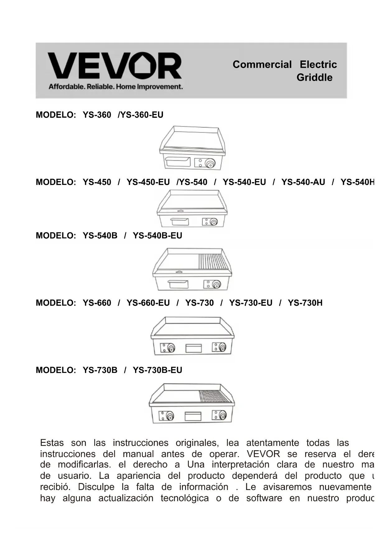 YS540EU - Placa de parrilla Vevor - Manual de uso y guía de instrucciones gratis