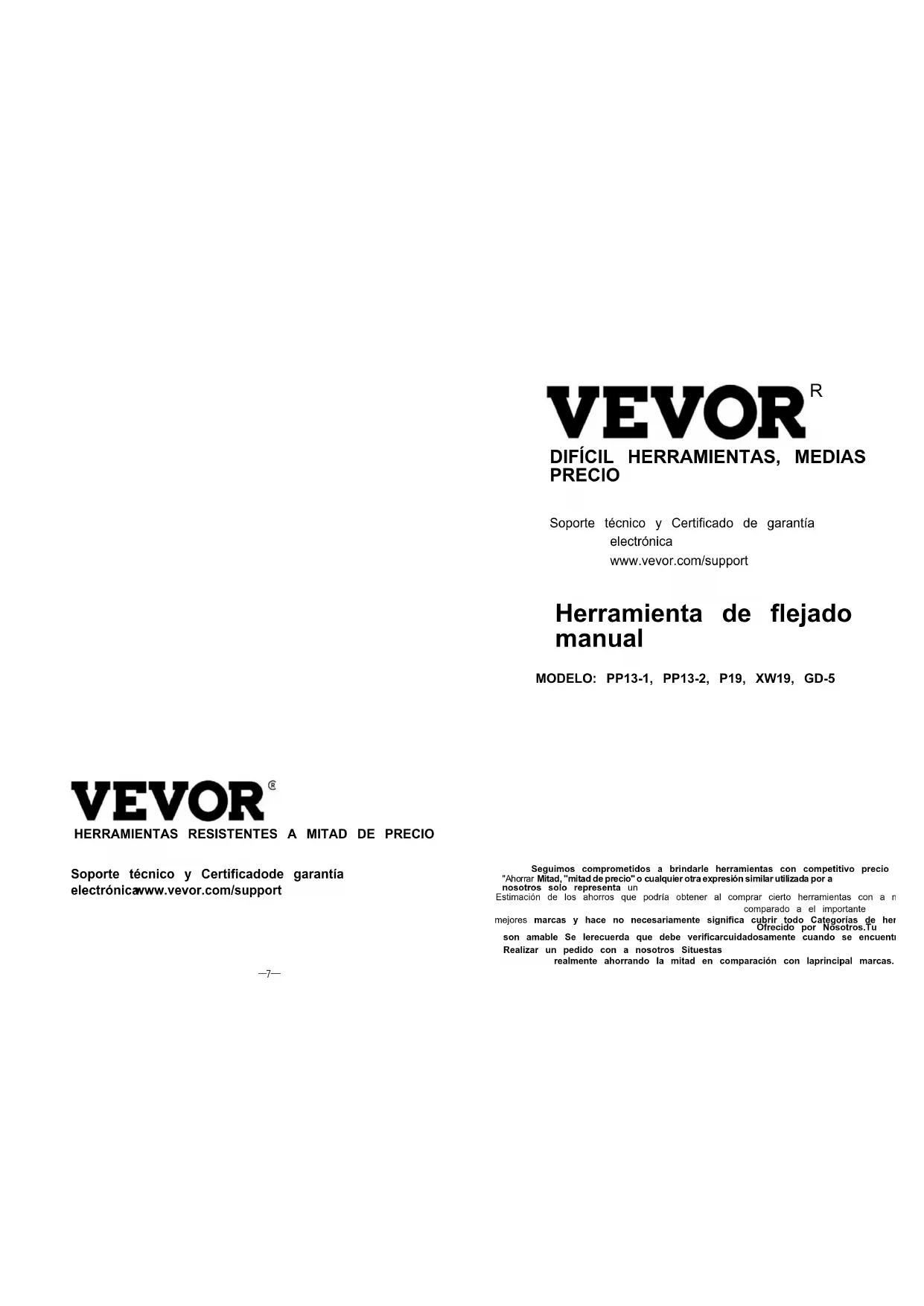 PRECIO Soporte técnico y Certificado de garantía electrónica www.vevor.com/support Herramienta de flejado manual MODELO: PP13-1, PP13-2, P19, XW19, GD-5 Seguimos comprometidos a brindarle herramientas con competitivo precio . "Ahorrar Mitad, "mitad de precio" o cualquier otra expresión similar utilizada por a nosotros solo representa un Estimación de los ahorros que podría obtener al comprar cierto herramientas con a nosotros comparado a el importante mejores marcas y hace no necesariamente significa cubrir todo Categorías de herramientas Ofrecido por Nosotros.Tu son amable Se lerecuerda que debe verificarcuidadosamente cuando se encuentre Realizar un pedido con a nosotros Situestas realmente ahorrando la mitad en comparación con laprincipal marcas.—