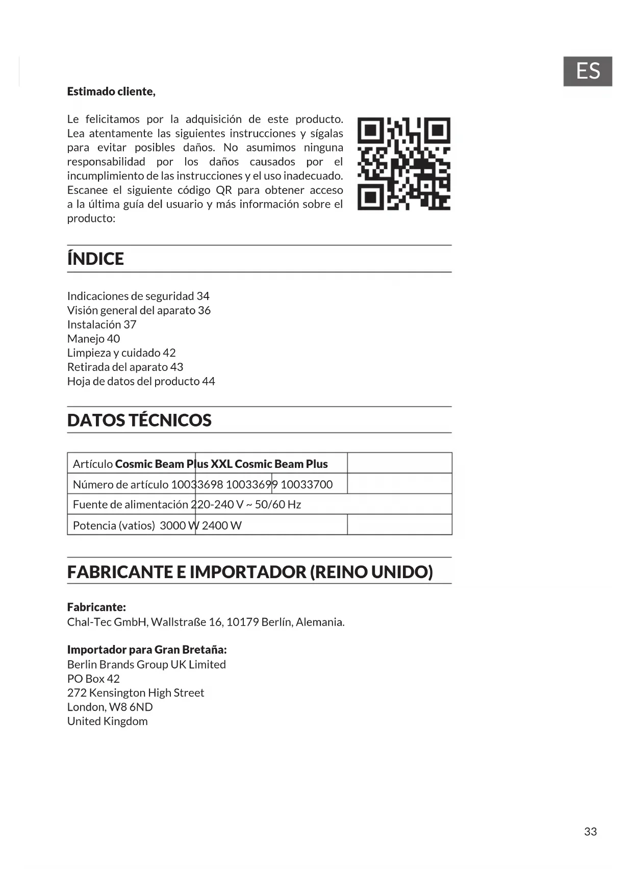 Artículo Cosmic Beam Plus XXL Cosmic Beam Plus Número de artículo 10033698 10033699 10033700 Fuente de alimentación 220-240 V ~ 50/60 Hz Potencia (vatios) 3000 W 2400 W FABRICANTE E IMPORTADOR (REINO UNIDO) Fabricante: Chal-Tec GmbH, Wallstraße 16, 10179 Berlín, Alemania. Importador para Gran Bretaña: Berlin Brands Group UK Limited PO Box 42 272 Kensington High Street London, W8 6ND United Kingdom34