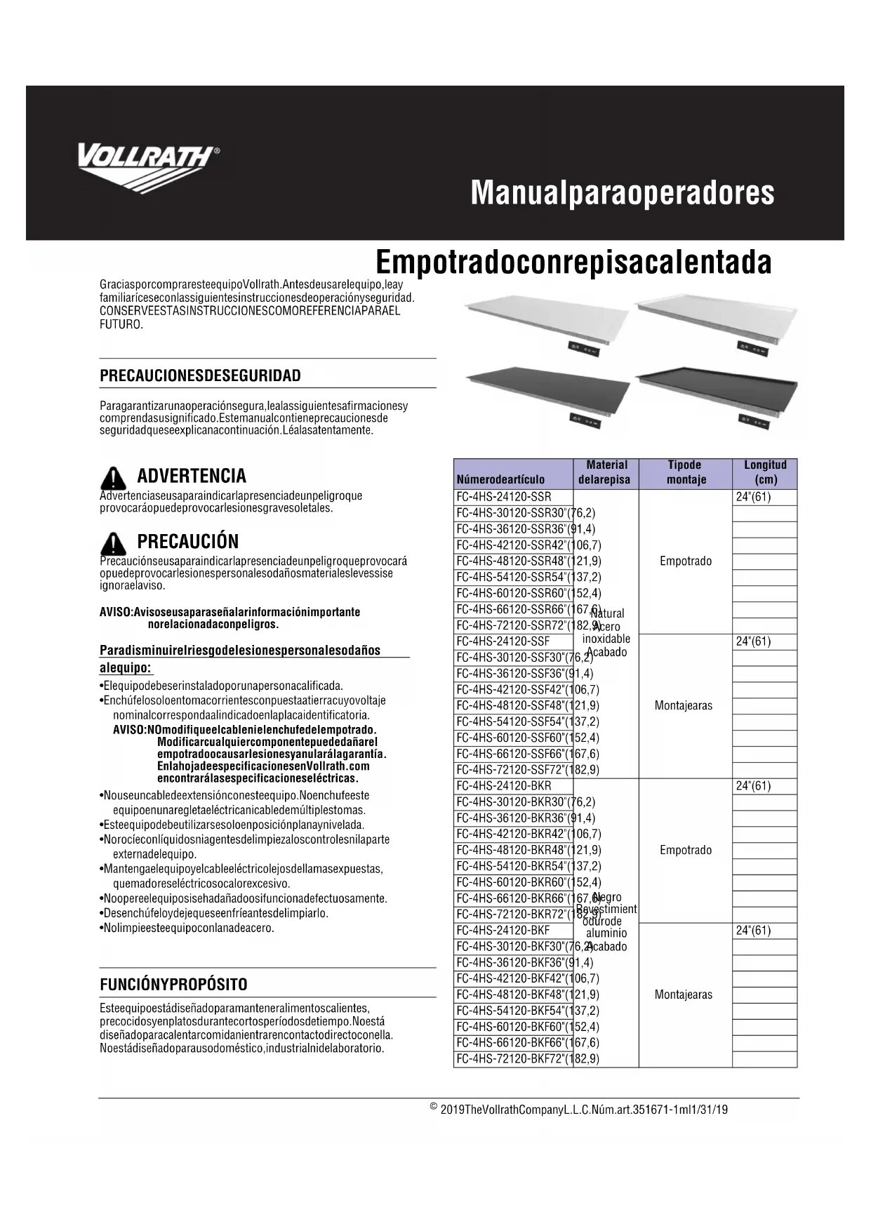 2019 The Vollrath Company L.L.C. Núm. art. 351671-1 ml 1/31/19 Gracias por comprar este equipo Vollrath. Antes de usar el equipo, lea y familiarícese con las siguientes instrucciones de operación y seguridad. CONSERVE ESTAS INSTRUCCIONES COMO REFERENCIA PARA EL FUTURO.
