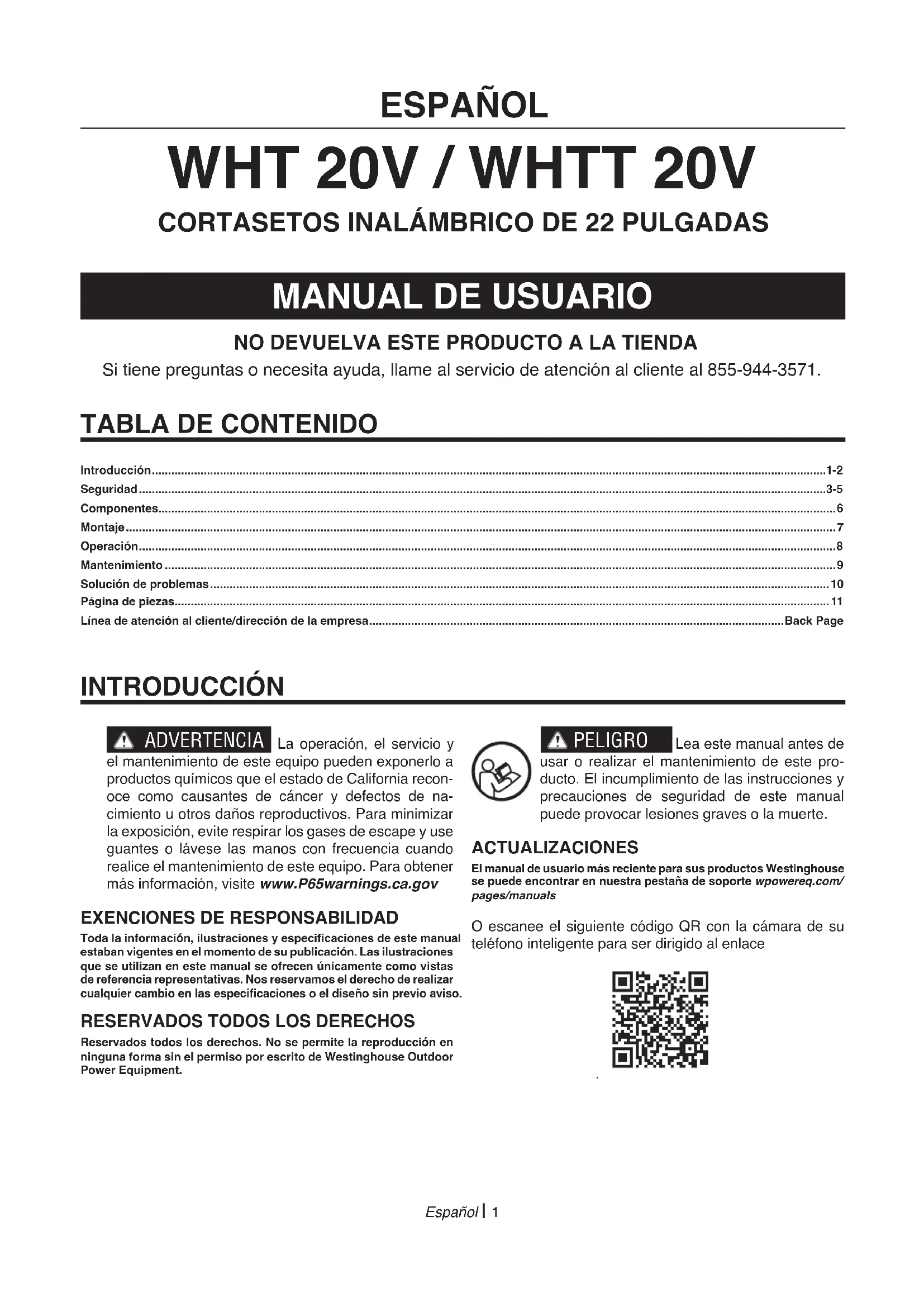 Reservados todos los derechos. No se permite la reproducción en ninguna forma sin el permiso por escrito de Westinghouse Outdoor Power Equipment. PELIGRO Lea este manual antes de usar o realizar el mantenimiento de este pro-ducto. El incumplimiento de las instrucciones y precauciones de seguridad de este manual puede provocar lesiones graves o la muerte. ACTUALIZACIONES El manual de usuario más reciente para sus productos Westinghouse se puede encontrar en nuestra pestaña de soporte wpowereq.com/pages/manualsO escanee el siguiente código QR con la cámara de su teléfono inteligente para ser dirigido al enlace