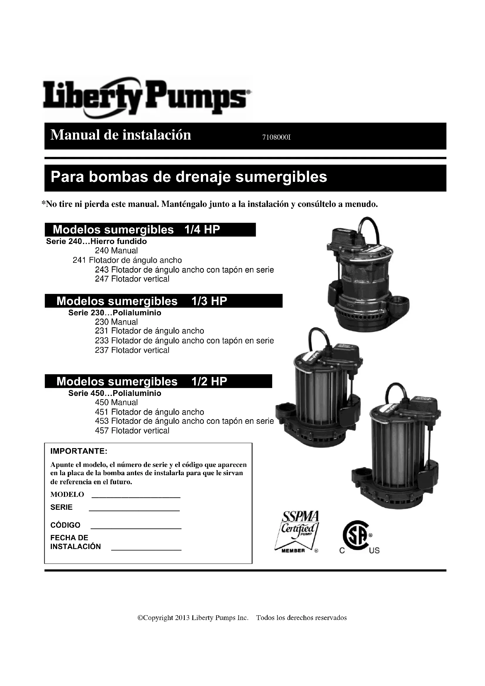 *No tire ni pierda este manual. Manténgalo junto a la instalación y consúltelo a menudo. Modelos sumergibles 1/4 HP Serie 240…Hierro fundido 240 Manual 241 Flotador de ángulo ancho 243 Flotador de ángulo ancho con tapón en serie 247 Flotador vertical Modelos sumergibles 1/3 HP Serie 230…Polialuminio 230 Manual 231 Flotador de ángulo ancho 233 Flotador de ángulo ancho con tapón en serie 237 Flotador vertical