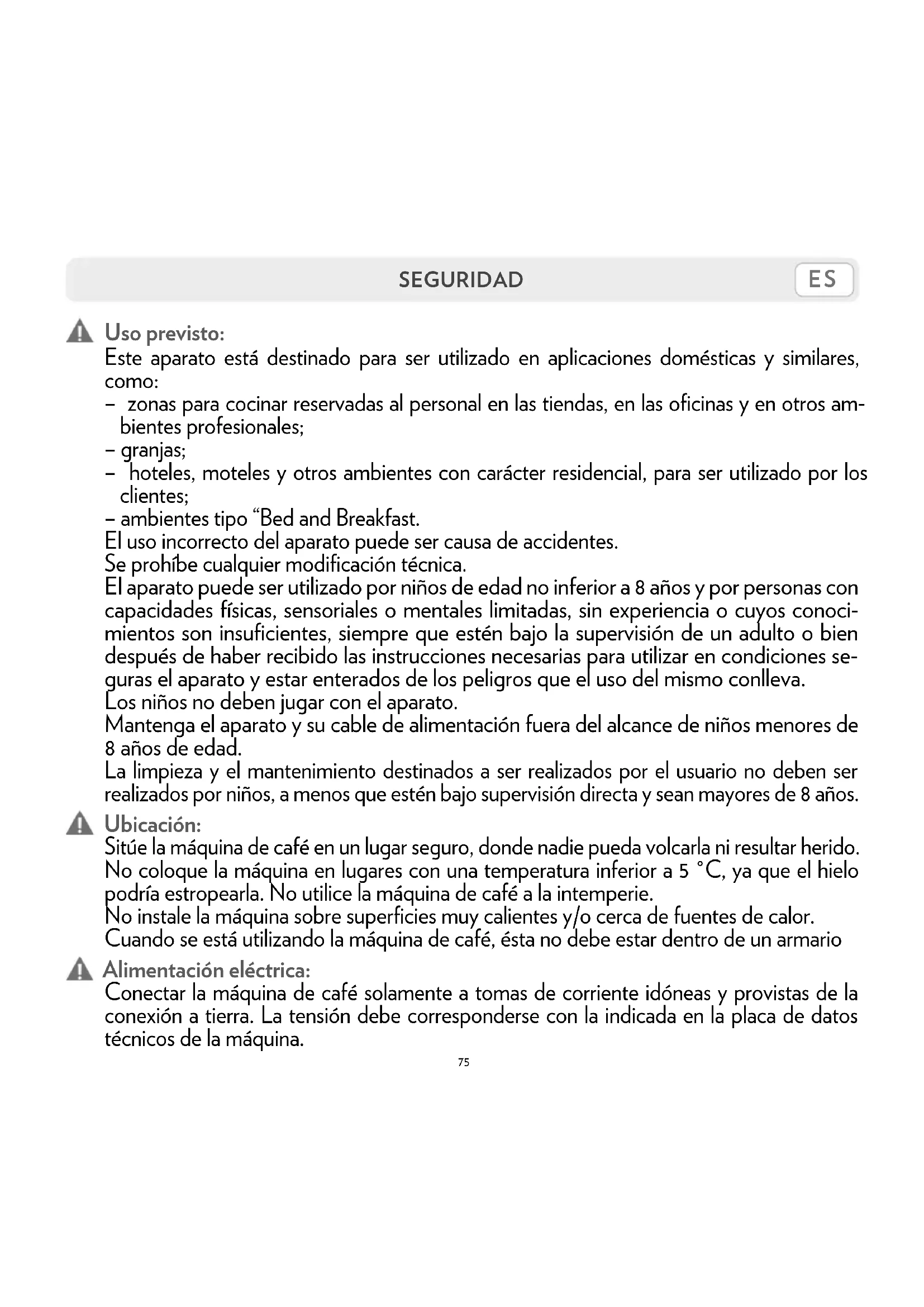 SEGURIDAD Uso previsto: Este aparato está destinado para ser utilizado en aplicaciones domésticas y similares, como: – zonas para cocinar reservadas al personal en las tiendas, en las oficinas y en otros am- bientes profesionales; – granjas; – hoteles, moteles y otros ambientes con carácter residencial, para ser utilizado por los clientes; – ambientes tipo “Bed and Breakfast. El uso incorrecto del aparato puede ser causa de accidentes. Se prohíbe cualquier modificación técnica. El aparato puede ser utilizado por niños de edad no inferior a 8 años y por personas con capacidades físicas, sensoriales o mentales limitadas, sin experiencia o cuyos conoci- mientos son insuficientes, siempre que estén bajo la supervisión de un adulto o bien después de haber recibido las instrucciones necesarias para utilizar en condiciones se- guras el aparato y estar enterados de los peligros que el uso del mismo conlleva. Los niños no deben jugar con el aparato. Mantenga el aparato y su cable de alimentación fuera del alcance de niños menores de 8 años de edad. La limpieza y el mantenimiento destinados a ser realizados por el usuario no deben ser realizados por niños, a menos que estén bajo supervisión directa y sean mayores de 8 años. Ubicación: Sitúe la máquina de café en un lugar seguro, donde nadie pueda volcarla ni resultar herido. No coloque la máquina en lugares con una temperatura inferior a 5 °C, ya que el hielo podría estropearla. No utilice la máquina de café a la intemperie. No instale la máquina sobre superficies muy calientes y/o cerca de fuentes de calor. Cuando se está utilizando la máquina de café, ésta no debe estar dentro de un armario Alimentación eléctrica: Conectar la máquina de café solamente a tomas de corriente idóneas y provistas de la conexión a tierra. La tensión debe corresponderse con la indicada en la placa de datos técnicos de la máquina.76 ITES SEGURIDAD Cable de alimentación: No utilice la máquina de café si el cable de alimentación es defectuoso. Si el cable de alimentación está dañado, debe ser sustituido por el fabricante, por el servicio de asistencia técnica, para evitar cualquier riesgo. No dejar que el ca- ble de alimentación pase por esquinas o aristas cortantes o sobre objetos muy calientes. No transportar o tirar de la máquina de café sujetándola por el cable. No desconectar la clavija tirando del cable; no tocarla con las manos mojadas. Evitar que el cable de alimentación caiga libremente desde mesas o estanterías. Peligro de electrocución: No permitir que las partes sujetas a tensión eléctrica entren en contacto con el agua. Este aparato no debe sumergirse. Proteger a los niños menores de 8 años de edad: Vigile a los niños para evitar que jueguen con el aparato. Los niños no se dan cuenta del peligro que entrañan los electrodomésticos. No deje a su alcance los materiales utilizados para embalar la máquina. Peligro de quemaduras: No toque las piezas calientes (porta cápsulas, etc.) justo después de utilizar el aparato. Durante la preparación del café, tenga cuidado con las posibles salpica- duras de líquido caliente. Limpieza: Antes de limpiar la máquina, es indispensable que desconecte la clavija de la toma de corriente y que espere a que la máquina se enfríe. ¡No sumerja la máquina en agua! Está totalmente prohibido manipular el interior de la máquina. Cambiar el agua en el depósito después de 3 días de no utilizar la máquina de café. Para no dañar el aparato durante la limpieza, no utilizar deter- gentes alcalinos sino un paño suave y un detergente delicado.77