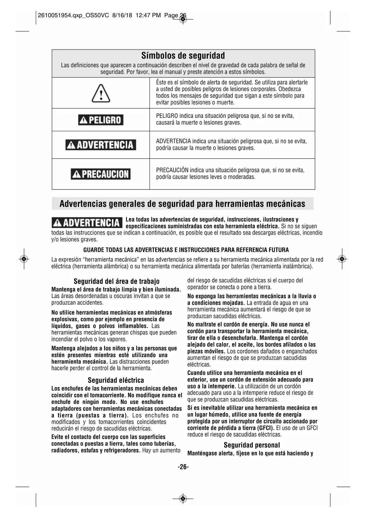 Éste es el símbolo de alerta de seguridad. Se utiliza para alertarle a usted de posibles peligros de lesiones corporales. Obedezca todos los mensajes de seguridad que sigan a este símbolo para evitar posibles lesiones o muerte. PELIGRO indica una situación peligrosa que, si no se evita, causará la muerte o lesiones graves. ADVERTENCIA indica una situación peligrosa que, si no se evita, podría causar la muerte o lesiones graves. PRECAUCIÓN indica una situación peligrosa que, si no se evita, podría causar lesiones leves o moderadas. 2610051954.qxp_OS50VC 8/16/18 12:47 PM Page 26-27- use el sentido común cuando esté utilizando una herramienta mecánica. No use una herramienta mecánica cuando esté cansado o bajo la influencia de drogas, alcohol o medicamentos. Un momento de distracción mientras esté utilizando herramientas mecánicas podría causar lesiones corporales graves. Use equipo de protección personal. Use siempre protección de los ojos. El equipo de protección, como por ejemplo una máscara antipolvo, calzado de seguridad antideslizante, casco o protección de oídos, utilizado para las condiciones apropiadas, reducirá las lesiones corporales. Evite el arranque accidental. Asegúrese de que el interruptor esté en la posición de apagado antes de conectar la herramienta a la fuente de energía y / o al paquete de batería, levantar la herramienta o transportarla. Transportar herramientas mecánicas con un dedo en el interruptor o encender herramientas mecánicas que tengan el interruptor en la posición de encendido invita a que se produzcan accidentes. Quite todas las llaves de ajuste o de tuerca antes de encender la herramienta mecánica. Una llave de tuerca o de ajuste que se deje colocada en una pieza giratoria de la herramienta mecánica podría causar lesiones corporales. No intente alcanzar demasiado lejos. Mantenga un apoyo de los pies y un equilibrio apropiados en todo momento. Esto permite controlar mejor la herramienta mecánica en situaciones inesperadas. Vístase adecuadamente. No use ropa holgada ni alhajas holgadas. Mantenga el pelo, la ropa y los guantes alejados de las piezas móviles. La ropa holgada, las alhajas holgadas o el pelo largo pueden quedar atrapados en las piezas móviles. Si se proporcionan dispositivos para la conexión de instalaciones de extracción y recolección de polvo, asegúrese de que dichas instalaciones estén conectadas y se usen correctamente. El uso de dispositivos de recolección de polvo puede reducir los peligros relacionados con el polvo. No deje que la familiaridad obtenida con el uso frecuente de las herramientas le haga volverse complaciente e ignorar los principios de seguridad de las herramientas. Una acción descuidada puede causar lesiones graves en una fracción de segundo. Uso y cuidado de las herramientas mecánicas No fuerce la herramienta mecánica. Use la herramienta mecánica correcta para la aplicación que desee realizar. La herramienta mecánica correcta hará el trabajo mejor y con más seguridad a la capacidad nominal para la que fue diseñada. No use la herramienta mecánica si el interruptor no la enciende y apaga. Toda herramienta mecánica que no se pueda controlar con el interruptor es peligrosa y debe ser reparada. Desconecte el enchufe de la fuente de alimentación y/o retire el paquete de batería de la herramienta eléctrica, si es extraíble, antes de hacer cualquier ajuste, cambiar accesorios o almacenar herramientas eléctricas. Dichas medidas preventivas de seguridad reducen el riesgo de arrancar accidentalmente la herramienta mecánica. Guarde las herramientas que no esté usando fuera del alcance de los niños y no deje que personas que no estén familiarizadas con la herramienta mecánica o con estas instrucciones utilicen la herramienta. Las herramientas mecánicas son peligrosas en manos de usuarios que no hayan recibido capacitación. Mantenga las herramientas eléctricas y sus accesorios. Compruebe si hay piezas móviles desalineadas o que se atoran, si hay piezas rotas y si existe cualquier otra situación que podría afectar el funcionamiento de la herramienta mecánica. Si la herramienta mecánica está dañada, haga que la reparen antes de usarla. Muchos accidentes son causados por herramientas mecánicas mantenidas deficientemente. Mantenga las herramientas de corte afiladas y limpias. Es menos probable que las herramientas de corte mantenidas apropiadamente, con bordes de corte afilados, se atoren, y dichas herramientas son más fáciles de controlar. Utilice la herramienta mecánica, los accesorios, las brocas de la herramienta, etc., de acuerdo con estas instrucciones, teniendo en cuenta las condiciones de trabajo y el trabajo que se vaya a realizar. El uso de la herramienta mecánica para operaciones distintas a aquéllas para las que fue diseñada podría causar una situación peligrosa. Mantenga secos, limpios y libres de aceite y grasa los mangos y las superficies de agarre. Si están resbalosos, los mangos y las superficies de agarre no permiten un manejo y un control seguros de la herramienta en situaciones inesperadas. Servicio de ajustes y reparaciones Haga que su herramienta mecánica reciba servicio de un técnico de reparaciones calificado, utilizando únicamente piezas de repuesto idénticas. Esto asegurará que se mantenga la seguridad de la herramienta mecánica. Desarrolle un programa de mantenimiento periódico de la herramienta. Cuando limpie una herramienta, tenga cuidado de no desmontar ninguna de sus partes, ya que los cables internos podrían reubicarse incorrectamente o pellizcarse, o los resortes de retorno de los protectores de seguridad podrían montarse incorrectamente. Ciertos agentes de limpieza, tales como gasolina, tetracloruro de carbono, amoníaco, etc., podrían dañar las piezas de plástico. El mantenimiento preventivo rea lizado por personal no autorizado pude dar lugar a la colocación in - correcta de cables y com ponentes interno