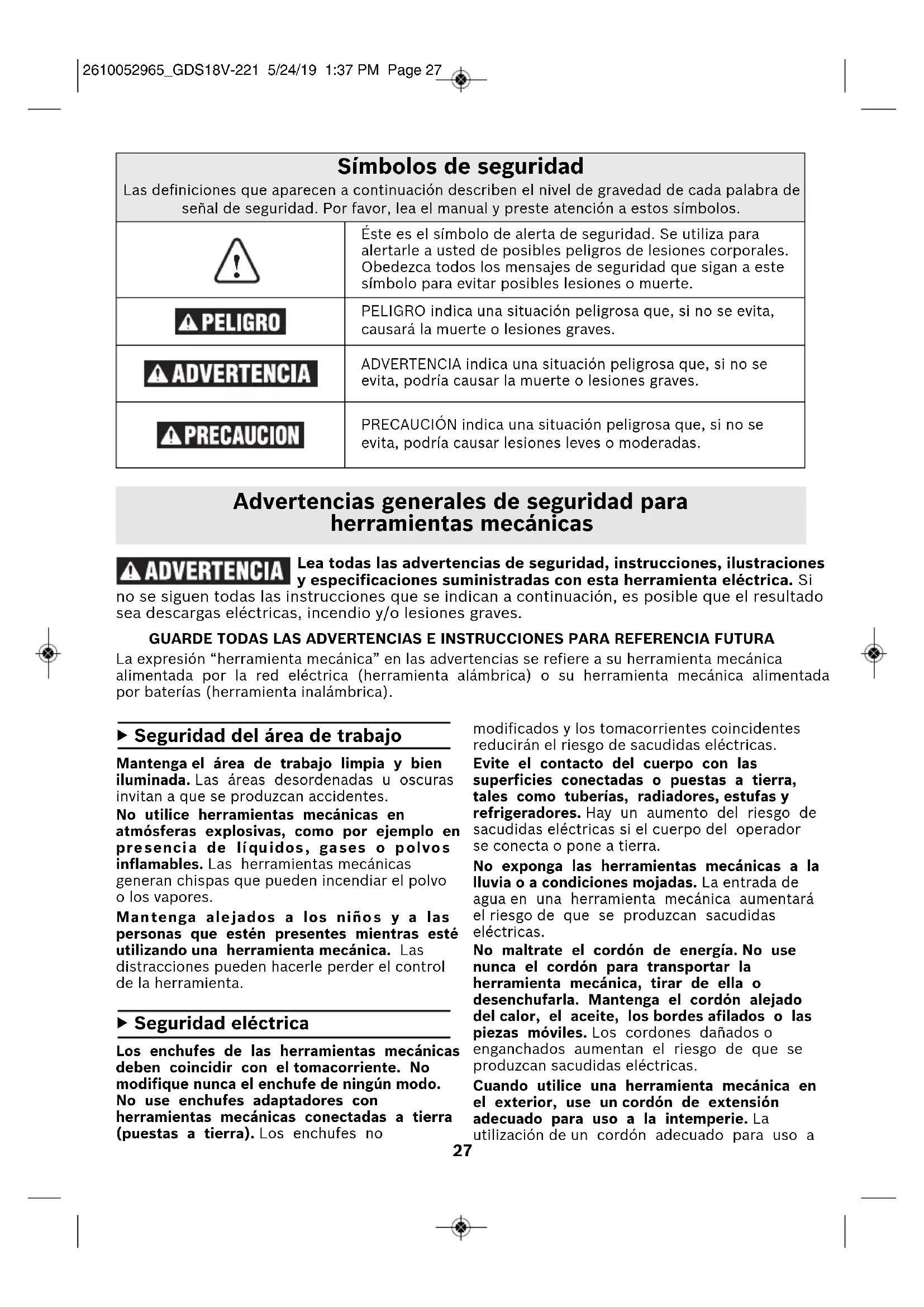 Éste es el símbolo de alerta de seguridad. Se utiliza paraalertarle a usted de posibles peligros de lesiones corporales.Obedezca todos los mensajes de seguridad que sigan a estesímbolo para evitar posibles lesiones o muerte.PELIGRO indica una situación peligrosa que, si no se evita,causará la muerte o lesiones graves.ADVERTENCIA indica una situación peligrosa que, si no seevita, podría causar la muerte o lesiones graves.PRECAUCIÓN indica una situación peligrosa que, si no seevita, podría causar lesiones leves o moderadas. 2610052965_GDS18V-221 5/24/19 1:37 PM Page 2728 la intemperie reduce el riesgo de que se produzcan sacudidas eléctricas. Si es inevitable utilizar una herramienta mecánica en un lugar húmedo, utilice una fuente de energía protegida por un interruptor de circuito accionado por corriente de pérdida a tierra (GFCI). El uso de un GFCI reduce el riesgo de sacudidas eléctricas. Seguridad personal Manténgase alerta, fíjese en lo que está haciendo y use el sentido común cuando esté utilizando una herramienta mecánica. No use una herramienta mecánica cuando esté cansado o bajo la influencia de drogas, alcohol o medicamentos. Un momento de distracción mientras esté utilizando herramientas mecánicas podría causar lesiones corporales graves. Use equipo de protección personal. Use siempre protección de los ojos. El equipo de protección, como por ejemplo una máscara antipolvo, calzado de seguridad antideslizante, casco o protección de oídos, utilizado para las condiciones apropiadas, reducirá las lesiones corporales. Evite el arranque accidental. Asegúrese de que el interruptor esté en la posición de apagado antes de conectar la herramienta a la fuente de energía y / o al paquete de batería, levantar la herramienta o transportarla. Transportar herramientas mecánicas con un dedo en el interruptor o encender herramientas mecánicas que tengan el interruptor en la posición de encendido invita a que se produzcan accidentes. Quite todas las llaves de ajuste o de tuerca antes de encender la herramienta mecánica. Una llave de tuerca o de ajuste que se deje colocada en una pieza giratoria de la herramienta mecánica podría causar lesiones corporales. No intente alcanzar demasiado lejos. Mantenga un apoyo de los pies y un equilibrio apropiados en todo momento. Esto permite controlar mejor la herramienta mecánica en situaciones inesperadas. Vístase adecuadamente. No use ropa holgada ni alhajas holgadas. Mantenga el pelo, la ropa y los guantes alejados de las piezas móviles. La ropa holgada, las alhajas holgadas o el pelo largo pueden quedar atrapados en las piezas móviles. Si se proporcionan dispositivos para la conexión de instalaciones de extracción y recolección de polvo, asegúrese de que dichas instalaciones estén conectadas y se usen correctamente. El uso de dispositivos de recolección de polvo puede reducir los peligros relacionados con el polvo. No deje que la familiaridad obtenida con el uso frecuente de las herramientas le haga volverse complaciente e ignorar los principios de seguridad de las herramientas. Una acción descuidada puede causar lesiones graves en una fracción de segundo. Uso y cuidado de las herramientas mecánicas No fuerce la herramienta mecánica. Use la herramienta mecánica correcta para la aplicación que desee realizar. La herramienta mecánica correcta hará el trabajo mejor y con más seguridad a la capacidad nominal para la que fue diseñada. No use la herramienta mecánica si el interruptor no la enciende y apaga. Toda herramienta mecánica que no se pueda controlar con el interruptor es peligrosa y debe ser reparada. Desconecte el enchufe de la fuente de alimentación y/o retire el paquete de batería de la herramienta eléctrica, si es extraíble, antes de hacer cualquier ajuste, cambiar accesorios o almacenar herramientas eléctricas. Dichas medidas preventivas de seguridad reducen el riesgo de arrancar accidentalmente la herramienta mecánica. Guarde las herramientas que no esté usando fuera del alcance de los niños y no deje que personas que no estén familiarizadas con la herramienta mecánica o con estas instrucciones utilicen la herramienta. Las herramientas mecánicas son peligrosas en manos de usuarios que no hayan recibido capacitación. Mantenga las herramientas eléctricas y sus accesorios. Compruebe si hay piezas móviles desalineadas o atoradas, si hay piezas rotas y cualquier otra situación que pueda afectar al funcionamiento de la herramienta eléctrica. Si la herramienta eléctrica está dañada, haga que sea reparada antes de utilizarla. Muchos accidentes son causados por herramientas mecánicas mantenidas deficientemente. Advertencias generales de seguridad para herramientas mecánicas 2610052965_GDS18V-221 5/24/19 1:37 PM Page 2829 Advertencias generales de seguridad para herramientas mecánicas Mantenga las herramientas de corte afiladas y limpias. Es menos probable que las herramientas de corte mantenidas apropiadamente, con bordes de corte afilados, se atoren, y dichas herramientas son más fáciles de controlar. Utilice la herramienta mecánica, los accesorios, las brocas de la herramienta, etc., de acuerdo con estas instrucciones, teniendo en cuenta las condiciones de trabajo y el trabajo que se vaya a realizar. El uso de la herramienta mecánica para operaciones distintas a aquéllas para las que fue diseñada podría causar una situación peligrosa. Mantenga secos, limpios y libres de aceite y grasa los mangos y las superficies de agarre. Si están resbalosos, los mangos y las superficies de agarre no permiten un manejo y un control seguros de la herramienta en situaciones inesperadas. ▶ Uso y cuidado de las herramientas alimentadas por baterías Recargue las baterías solamente con el cargador especificado por el fabricante. Un cargador que es adecuado para un tipo de paquete de batería puede crear un riesgo de incendio cuando se utiliza con otro paquete de batería. Uti