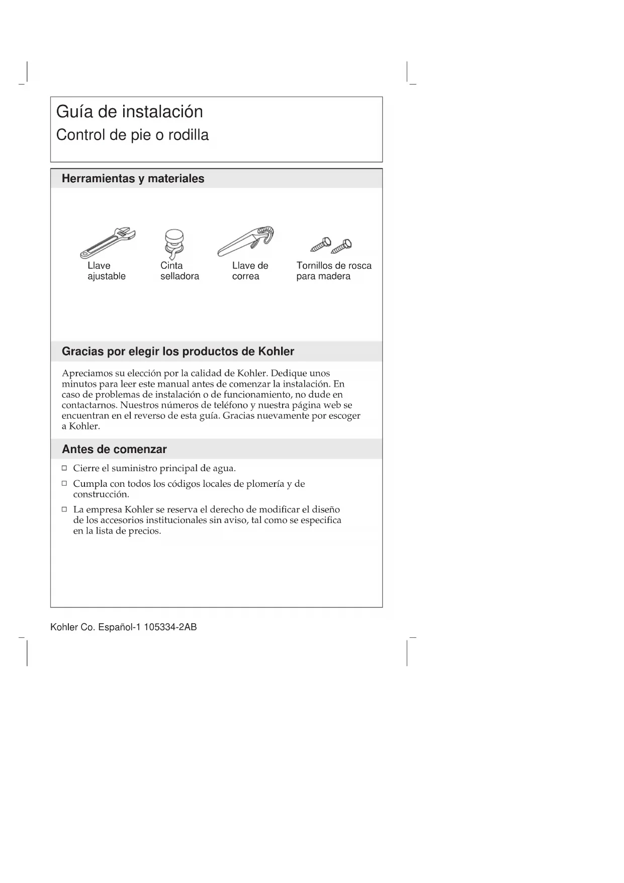 Apreciamos su elección por la calidad de Kohler. Dedique losamicos para leer este manual antes de comenzar la instalación. En caso de problemas de instalación o de funciona, no dude encontactarnos. Nuestros númeroos de téléphone y nuestra网页 web seencuentran en el reversal de esta guía. Gracias-Newamente por escoger a Kohler.