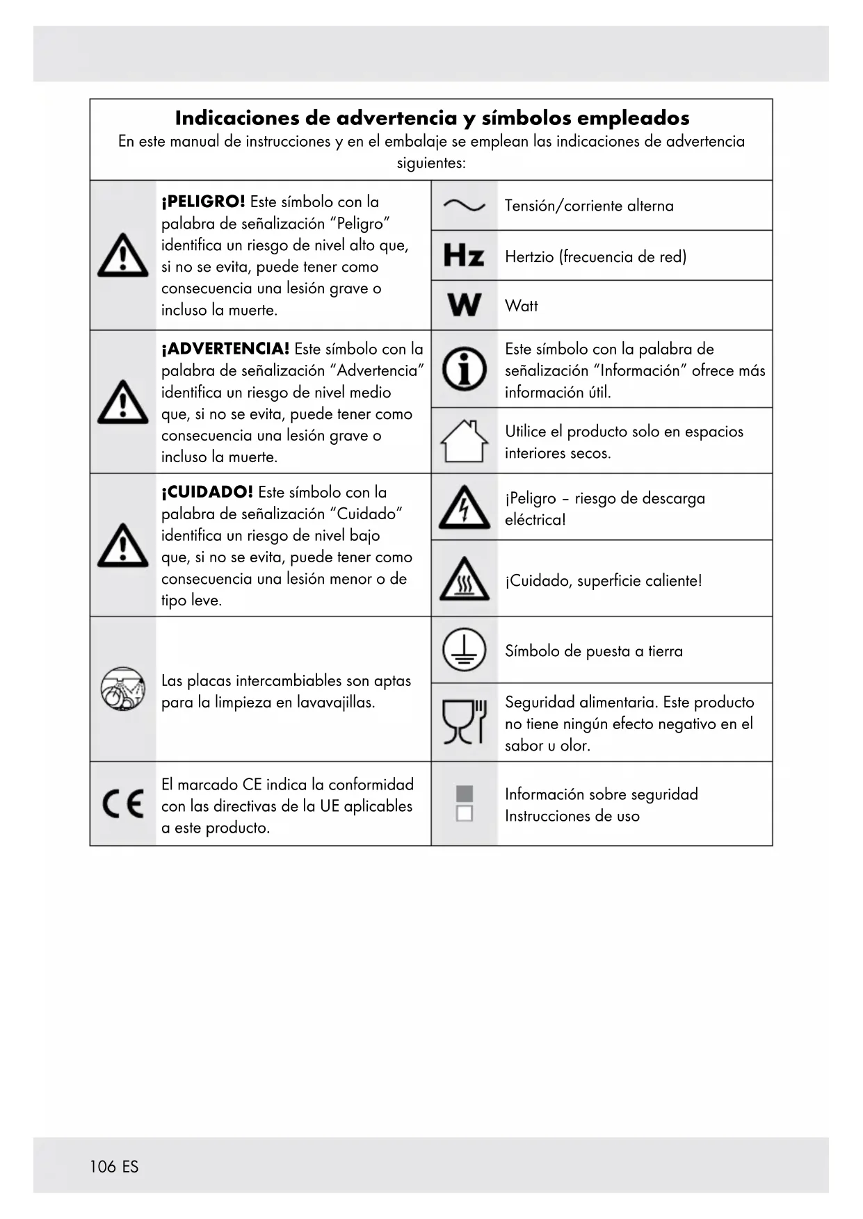 Indicaciones de advertencia y símbolos empleados En este manual de instrucciones y en el embalaje se emplean las indicaciones de advertencia siguientes: ¡PELIGRO! Este símbolo con la palabra de señalización “Peligro” identifica un riesgo de nivel alto que, si no se evita, puede tener como consecuencia una lesión grave o incluso la muerte. Tensión/corriente alterna Hertzio (frecuencia de red) Watt ¡ADVERTENCIA! Este símbolo con la palabra de señalización “Advertencia” identifica un riesgo de nivel medio que, si no se evita, puede tener como consecuencia una lesión grave o incluso la muerte. Este símbolo con la palabra de señalización “Información” ofrece más información útil. Utilice el producto solo en espacios interiores secos. ¡CUIDADO! Este símbolo con la palabra de señalización “Cuidado” identifica un riesgo de nivel bajo que, si no se evita, puede tener como consecuencia una lesión menor o de tipo leve. ¡Peligro– riesgo de descarga eléctrica! ¡Cuidado, superficie caliente! Las placas intercambiables son aptas para la limpieza en lavavajillas. Símbolo de puesta a tierra Seguridad alimentaria. Este producto no tiene ningún efecto negativo en el sabor u olor. El marcado CE indica la conformidad con las directivas de la UE aplicables a este producto. Información sobre seguridad Instrucciones de uso107