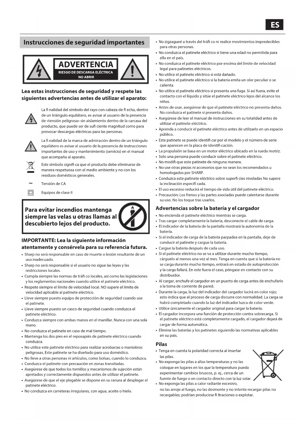 - Sharp no será responsable en caso de muerte o lesión resultante de un uso inadecuado.• Sharp no será responsable si el usuario no sigue las leyes y las restricciones locales.• Cumpla siempre las normas de trá co locales, así como las legislaciones y los reglamentos nacionales cuando utilice el patinete eléctrico.• Respete siempre el límite de velocidad local. NO supere el límite de velocidad aplicable al patinete eléctrico.• Lleve siempre puesto equipo de protección de seguridad cuando use el patinete.• Lleve siempre puesto un casco de seguridad cuando conduzca el patinete eléctrico.• Conduzca siempre con ambas manos en el manillar. Nunca con una sola mano.• No conduzca el patinete en caso de mal tiempo.• Mantenga los dos pies en el reposapiés de patinete eléctrico cuando conduzca.• No utilice este patinete eléctrico para realizar acrobacias o maniobras peligrosas. Este patinete se ha diseñado para uso doméstico.• No lleve a otras personas ni artículos, como bolsas, cuando lo conduzca.• Conduzca el patinete con precaución en zonas transitadas.• Asegúrese de que todos los tornillos y mecanismos de sujeción están apretados y correctamente dispuestos antes de utilizar el patinete.• Asegúrese de que el eje plegable se dispone en su ranura al desplegar el patinete eléctrico.• No conduzca en carreteras irregulares, con agua, aceite o hielo.• No zigzagueé a través del trá co ni realice movimientos impredecibles para otras personas.• No conduzca el patinete eléctrico si tiene una edad no permitida para ello en el país.• No conduzca el patinete eléctrico por encima del límite de velocidad legal para patinetes eléctricos.• No utilice el patinete eléctrico si está dañado.• No utilice el patinete eléctrico si la batería emita un olor peculiar o se calienta.• No utilice el patinete eléctrico si presenta una fuga. Si así fuera, evite el contacto con el líquido y sitúe el patinete eléctrico lejos del alcance los niños.• Antes de usar, asegúrese de que el patinete eléctrico no presenta daños. No conduzca el patinete si presenta daños.• Asegúrese de leer el manual de instrucciones en su totalidad antes de utilizar el patinete eléctrico.• Aprenda a conducir el patinete eléctrico antes de utilizarlo en un espacio público.• Este patinete se puede identi car por el modelo y el número de serie que aparecen en la placa de identi cación.• La propulsión se basa en un motor eléctrico ubicado en la rueda motriz.• Solo una persona puede conducir sobre el patinete eléctrico.• No modi que este patinete de ninguna manera.• No use otras piezas ni accesorios que no sean los recomendados u homologados por SHARP.• Conduzca este patinete eléctrico sobre super cies niveladas No supere la inclinación especi cada.• El uso excesivo reducirá el tiempo de vida útil del patinete eléctrico.• Precaución: Los frenos y las partes asociadas puede calentarse durante su uso. No los toque tras usarlos. Advertencias sobre la batería y el cargador