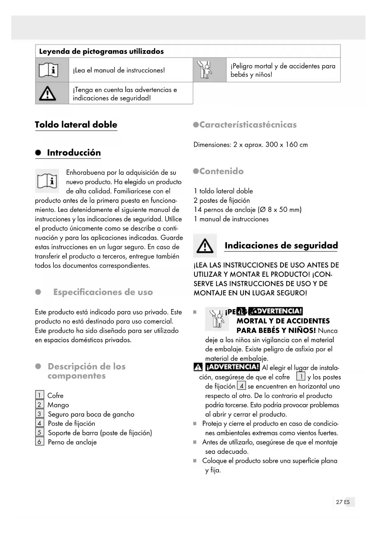 Perno de anclaje Características técnicas Dimensiones: 2 x aprox. 300 x 160 cm Contenido 1 toldo lateral doble postes de fijación 14 pernos de anclaje (Ø 8 x 50 mm) 1 manual de instrucciones Indicaciones de seguridad ¡LEA LAS INSTRUCCIONES DE USO ANTES DE