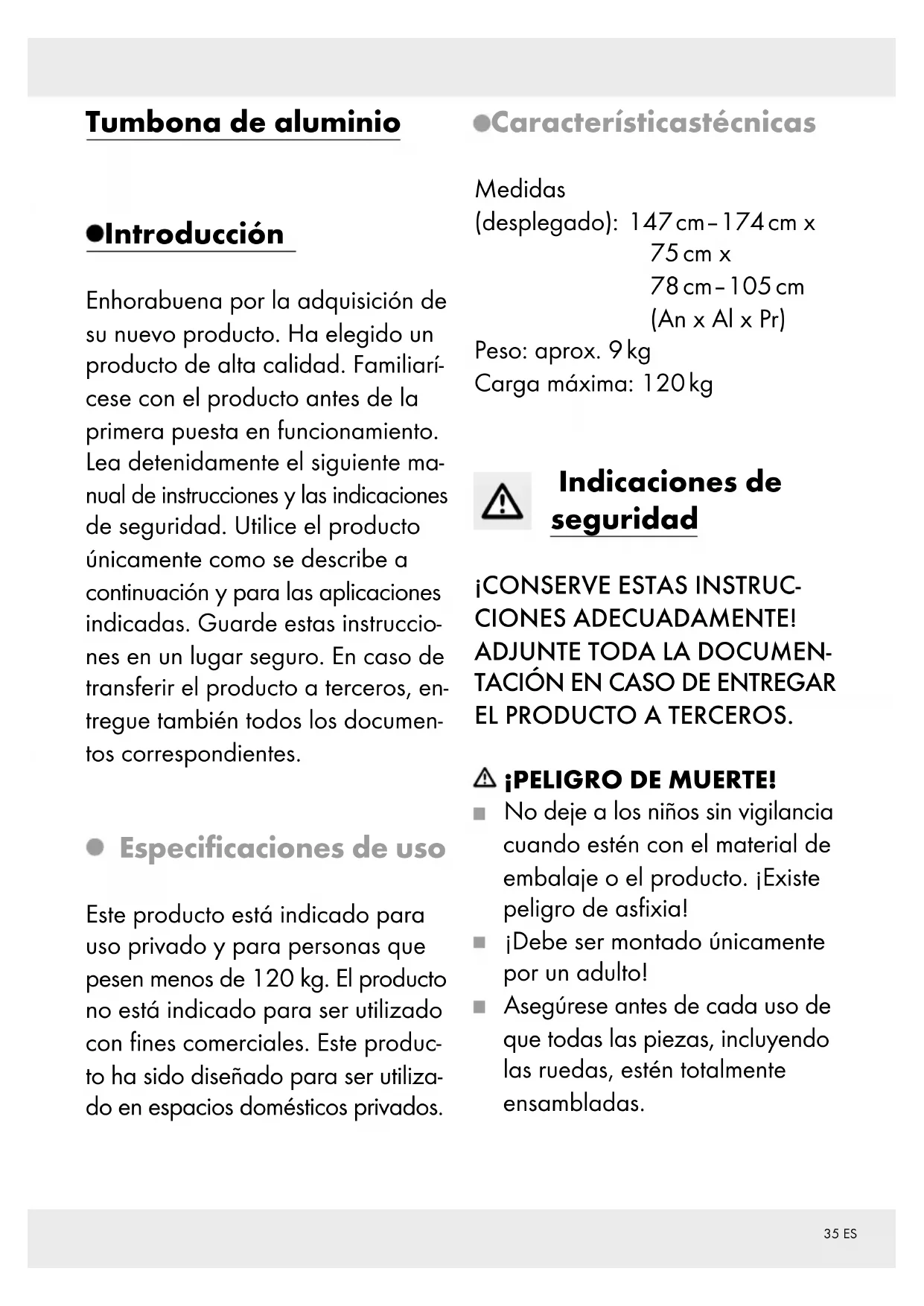 EL PRODUCTO A TERCEROS. ¡PELIGRO DE MUERTE! No deje a los niños sin vigilancia cuando estén con el material de embalaje o el producto. ¡Existe peligro de asfixia! ¡Debe ser montado únicamente por un adulto! Asegúrese antes de cada uso de que todas las piezas, incluyendo las ruedas, estén totalmente ensambladas.36 ES El producto podría perder la estabilidad y volcarse hacia un lado y / o caerse. Esto puede provocar lesiones y daños materiales. No coloque el producto cerca de llamas vivas. Proceda con precaución al desembalar y desplegar el producto. Asegúrese de que el producto está estable antes de utilizarlo. Coloque el artículo sobre una superficie firme y plana. Tenga en cuenta la carga máxima de 120 kg. Si se supera este límite de carga, podrían provocarse lesiones graves y / o daños materiales. Mantenga las manos alejadas del mecanismo de plegado para evitar lesiones. Asegúrese antes de utilizar el producto de que el mecanismo de plegado esté correctamente bloqueado. Antes de utilizar el producto, asegúrese de que este se ha abierto completamente. Este producto no es un juguete y si es utilizado por niños, deben contar siempre con la supervisión de un adulto. El producto solo debe utilizarse por una persona. Antes de cada uso revise el producto para detectar daños o signos de desgaste. El producto debe encontrarse en perfecto estado para poder utilizarse. No utilice el producto si detecta o sospecha de algún tipo de daño. Proteja el producto en caso de condiciones ambientales extremas como vientos fuertes. Almacene el producto solo en habitaciones protegidas. Nunca se ponga de pie sobre el producto.