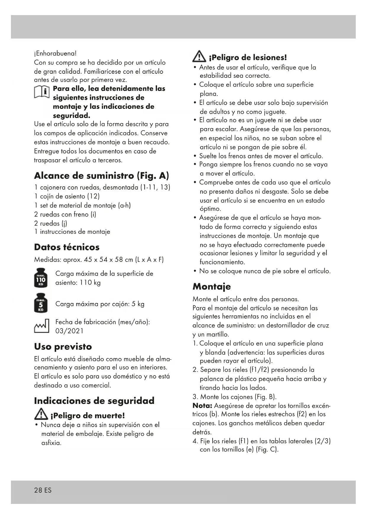 Carga máxima de la superficie de asiento: 110 kg Carga máxima por cajón: 5 kg Fecha de fabricación (mes/año): 03/2021 Uso previsto El artículo está diseñado como mueble de alma- cenamiento y asiento para el uso en interiores. El artículo es solo para uso doméstico y no está destinado a uso comercial. Indicaciones de seguridad ¡Peligro de muerte!