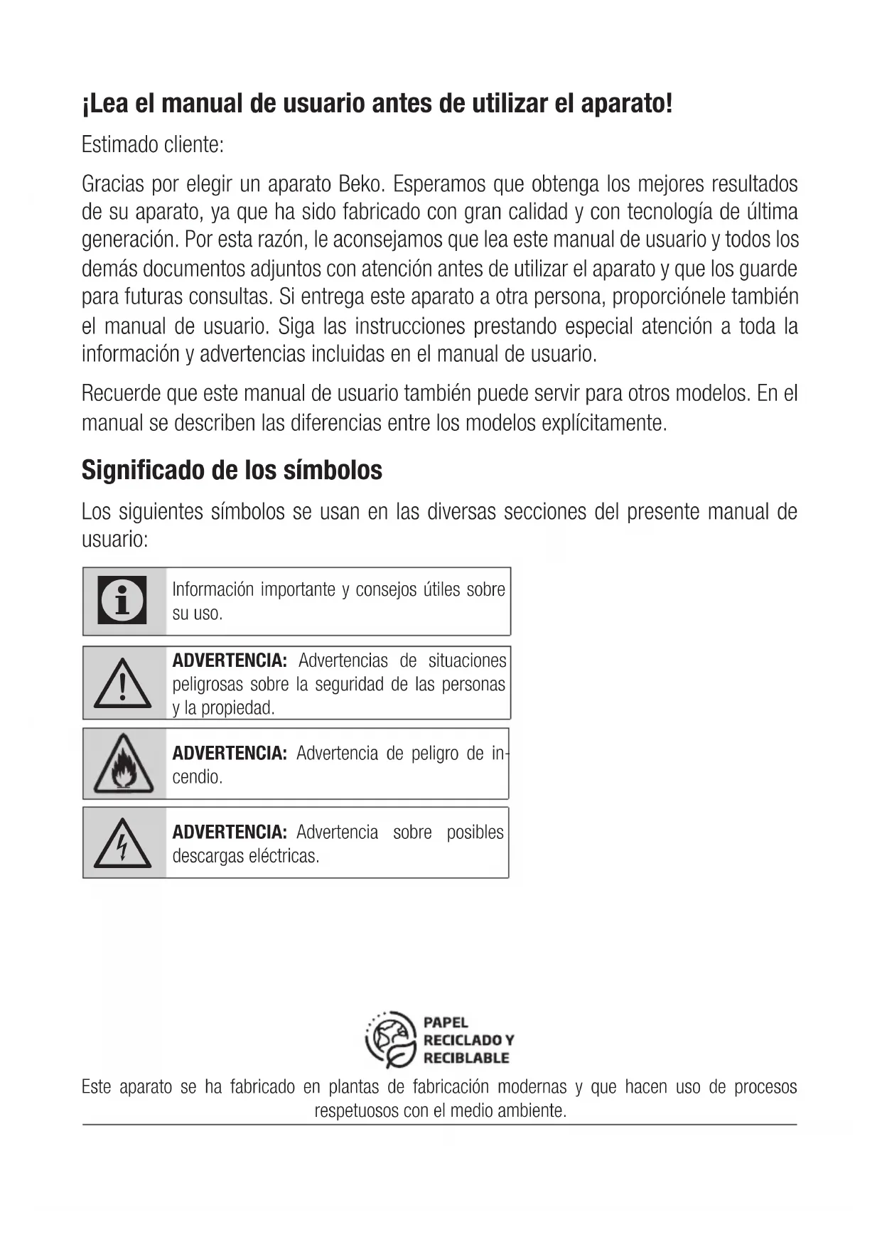 El coste de la reparación será a cargo del usuario en los siguientes casos: Los aparatos utilizados para uso profesional o no exclusivamente doméstico, en establecimientos públicos, industriales o comerciales. Los aparatos desmontados o manipulados por personas ajenas a los servicios técnicos expresamente autorizados. Las instalaciones, transporte, sustitución de aparatos, puestas en marcha, cambio de sentido de puertas. Intervenciones de mantenimiento o de información sobre el uso de los aparatos. Cambio de inyectores en aparatos de gas. Las averías provocadas por falta de mantenimiento o limpieza o aquellas provocadas por un uso indebido, sobrecarga, abandono o de manera no conforme a las instrucciones de uso o de instalación de los aparatos. Las averías producidas por causas fortuitas, siniestros de fuerza mayor o derivados de instalación incorrecta y en general, averías por causas ajenas al propio aparato. Las averías provocadas por conexiones que puedan presentar fluctuaciones, irregularidades o falta de uniformidad en el suministro, por ejemplo: suministro de agua impulsado por grupos de presión, energía solar, energía eólica, generadores eléctricos, u otro tipo de suministro no normalizado. La sustitución de materiales rotos o deteriorados por desgaste o uso no normal del aparato, o materiales consumibles tales como: juntas, plásticos, gomas, correas, cristales, escobillas, bombillas, asas, tiradores, tapas de quemadores, filtros, rejillas, ánodos de sacrificio (magnesio o similares) de calentadores o calderas, etc. Los aparatos que presenten oxidación, o daños por corrosión en esmaltes o pinturas, que puedan ser provocados por efectos químicos o electroquímicos del agua o cualquier otra sustancia, o aceleradas por circunstancias ambientales o climáticas no propicias. Defectos estéticos en serigrafía o pintura. Los daños de transporte o manipulación, golpes, etc. Los aparatos deben instalarse de forma accesible para su reparación, debiendo asumir el usuario los costes necesarios para el acceso al aparato para su reparación y sustitución. La presente garantía no afecta a los derechos de que dispone el consumidor conforme a lo previsto en el Real Decreto 1/2007, de 16 de noviembre, por el que se aprueba el texto refundido de la Ley General para la Defensa de los Consumidores y Usuarios y otras leyes complementarias, y la Ley 3/2014 que la modifica. El Servicio Oficial de Asistencia Técnica resolverá cualquier incidencia que pudiera precisar su electrodoméstico siempre que el aparato esté instalado de forma accesible. Para asegurarse que su electrodoméstico va a ser intervenido por un técnico oficial autorizado, rogamos solicite el carnet avalado por ANFEL (Asociación Nacional de Fabricantes de Electrodomésticos) a nuestros técnicos. Las marcas BEKO, ALTUS, BLOMBERG, y GRUNDIG se distribuyen por Beko Electronics España S.L. DATOS APARATO (a rellenar por el Distribuidor): Titular: Sello Establecimiento: Modelo: Núm. serie: Establecimiento: Fecha de compra: El garante e importador de su electrodoméstico es: BEKO ELECTRONICS ESPAÑA S.L. Calle Provenza nº 388 3º Barcelona 08025, España. El producto ha sido fabricado por ARÇELIK A.S (Arçelik A.S.Sütluce Karaagaç Cad. No:2-6 34445 Beyoglu, Istanbul, Turkey) o Arctic S.A. (210, 13 Decembrie St., 135200, Gaesti, Dambovita, Romania Conózcanos mejor en nuestra página: www.beko.com Conserve este documento, es importante para usted.Proszę najpierw przeczytać tę instrukcję obsługi! Szanowny Kliencie, dziękujemy za wybranie urządzenia marki Beko. Mamy nadzieję, że zakupione urządzenie, wyprodukowane z zapewnieniem wysokiej jakości przy użyciu najnowszych technologii, okaże się w pełni zadowalające. W tym celu przed użyciem urządzenia należy uważnie przeczytać całą instrukcję obsługi oraz dołączone dokumenty izachować je do wglądu na przyszłość. Przekazując urządzenie innemu użytkownikowi, należy dołączyć również niniejszą instrukcję. Należy postępować zgodnie z instrukcjami, zwracając uwagę na wszystkie informacje iostrzeżenia zamieszczone wniniejszym dokumencie. Należy pamiętać, że niniejsza instrukcja może odnosić się także do innych modeli. Różnice pomiędzy modelami są wyraźnie opisane winstrukcji. Znaczenie symboli Wróżnych częściach niniejszej instrukcji obsługi stosowane są następujące symbole: