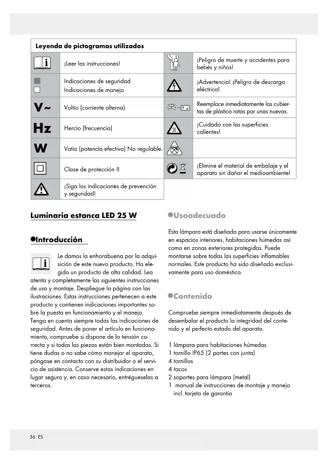 Esta lámpara está disnada para usarse únicamente en espacios interiores, habitaciones humedes asi como en zonas exteriores protegidas. Puede montarse sobre todas las superficies inflamables normales. Este producto ha sido disnado exclusivamente para uso domestico.