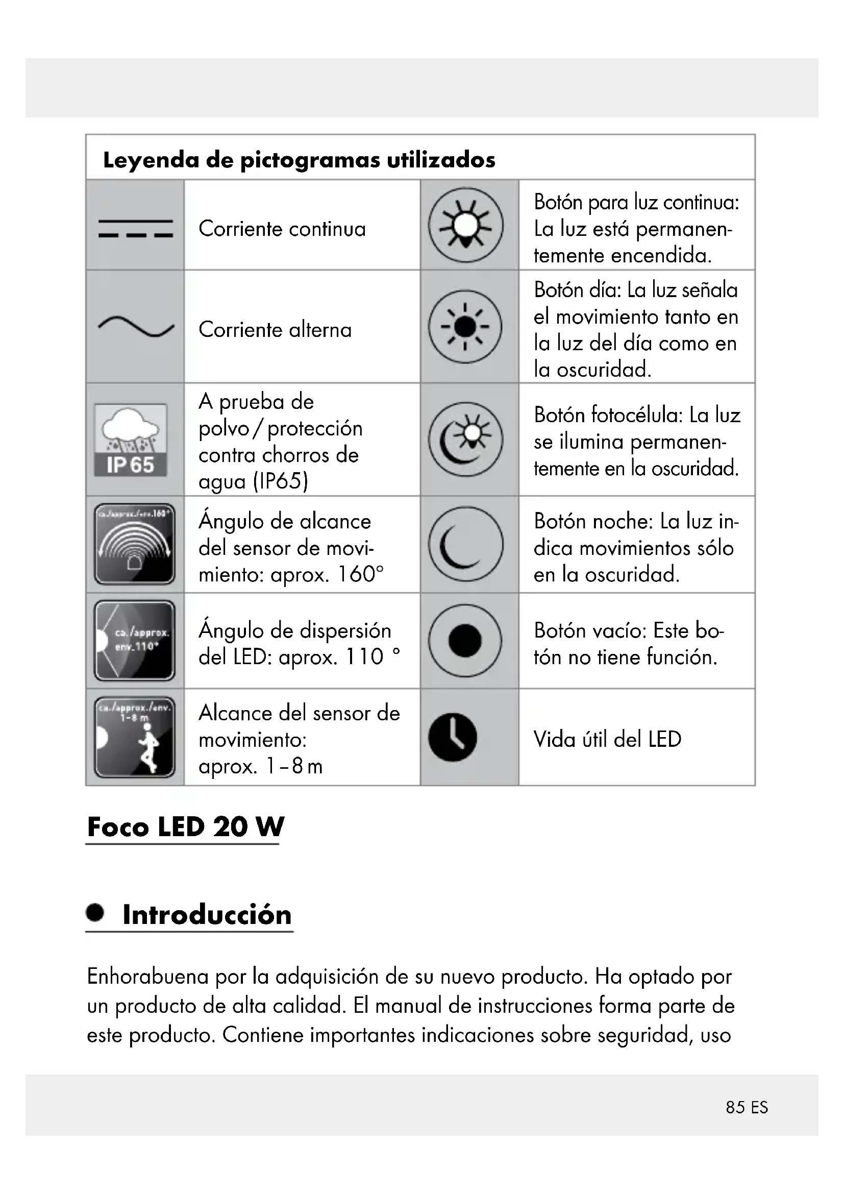 - no incluido87 ES Características técnicas Tensión de funcionamiento: 230 V∼ 50 Hz Consumo de potencia: 20 W Bombilla (COB-LED): 20 W (no reemplazable) Sensor de movimiento: Alcance: máx. 8 m (ajustable), Ángulo de alcance: aprox. 160 ° horizontal Clase de protección: I Grado de protección: IP65 (a prueba de polvo / protección contra chorros de agua) Peso: aprox. 640 g Dimensiones totales: 18 x 12,5 x 9,2 cm Superficie de proyección: máx. 18 x 12,5 cm Altura de montaje: aprox. 1,8–2,5 m Certificado por las organizaciones alemanas TÜV SÜD / GS Mando a distancia Alimentación de corriente: 3V Batería: 1 x 3 V ; batería de litio, tipo CR2025 Alcance: aprox. 12 m del producto Volumen de suministro Compruebe siempre inmediatamente después de desembalar el producto la integridad del contenido y el perfecto estado del mismo. 1 foco LED 2 tacos (Ø 8 mm) 2 tornillos (Ø 5 x 50 mm) 1 soporte 2 arandelas dentadas 2 arandelas 2 arandelas elásticas 2 tornillos de fijación88 ES 1 mando a distancia 1 batería de litio, tipo CR2025 (ya montada) 1 manual de instrucciones Indicaciones generales de seguridad ¡FAMILIARÍCESE CON TODAS LAS INSTRUCCIONES DE USO Y SEGURIDAD ANTES DE UTILIZAR ESTE PRODUCTO! ¡ADJUNTE IGUALMENTE TODA LA DOCUMENTACIÓN EN CASO DE ENTRE- GAR EL PRODUCTO A TERCEROS! ¡PELIGRO DE MUERTE O ACCIDENTE PARA BEBÉS Y NIÑOS! Nunca deje a los niños sin vigilancia con el material de embalaje. Podrían asfixiarse con el material de embalaje. Los niños no suelen ser conscientes de los peligros. Mantenga siempre el producto fuera del alcance de los niños. Este producto puede ser utilizado por niños mayores de 8 años, así como por personas con capacidades físicas, sensoriales o mentales reducidas o que cuenten con poca experiencia y / o falta de conoci- mientos, siempre y cuando se les haya enseñado cómo utilizar el producto de forma segura y hayan comprendido los peligros que pueden resultar de un mal uso del mismo. No permita que los niños jueguen con el producto. La limpieza y el mantenimiento nunca deben llevarse a cabo por niños sin la vigilancia de un adulto. ¡PELIGRO DE ASFIXIA! Los niños pueden ingerir algunas de las piezas pequeñas (por ej. los tornillos) y asfixiarse como consecuencia. Mantenga a los niños alejados de la zona de trabajo durante el montaje. Las bombillas no son reemplazables.89 ES Si las bombillas fallan al final de su vida útil, deberá reemplazar todo el producto. Montar el producto fuera del alcance del brazo. La regleta no está incluida en el volumen de suministro. Puede ser ne- cesaria la consulta de una persona calificada durante la instalación. Peligro de muerte por descarga eléctrica Antes de conectar el producto a la red, compruebe que no presenta ningún daño. Nunca utilice el producto si detecta cualquier tipo de desperfecto. Asegúrese antes del montaje de que la tensión de red disponible coincide con la tensión de servicio necesaria para el producto (230 V
