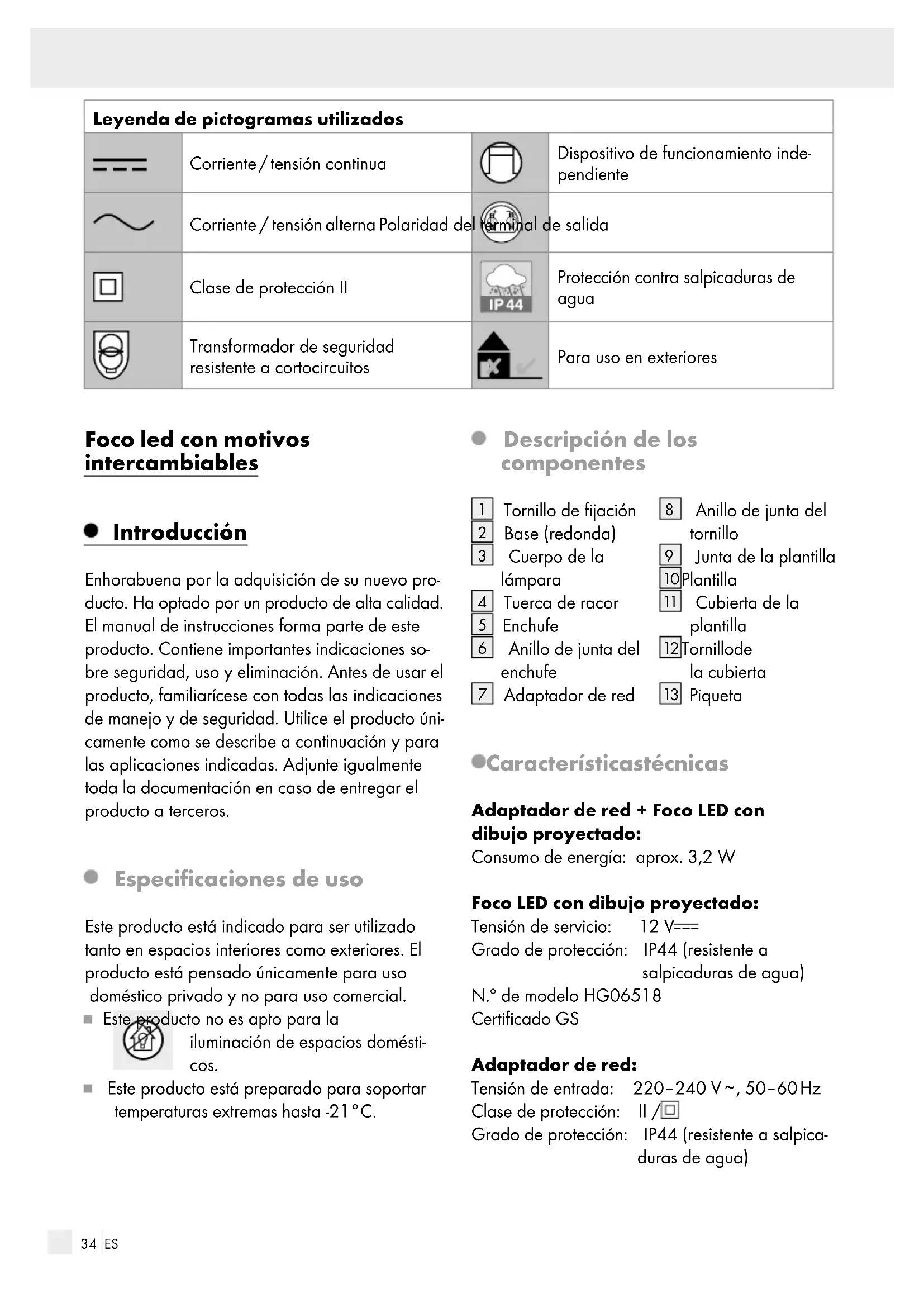 Piqueta Características técnicas Adaptador de red + Foco LED con dibujo proyectado: Consumo de energía: aprox. 3,2 W Foco LED con dibujo proyectado: Tensión de servicio: 12 V Grado de protección: IP44 (resistente a salpicaduras de agua) N.º de modelo HG06518 Certificado GS Adaptador de red: Tensión de entrada: 220–240 V