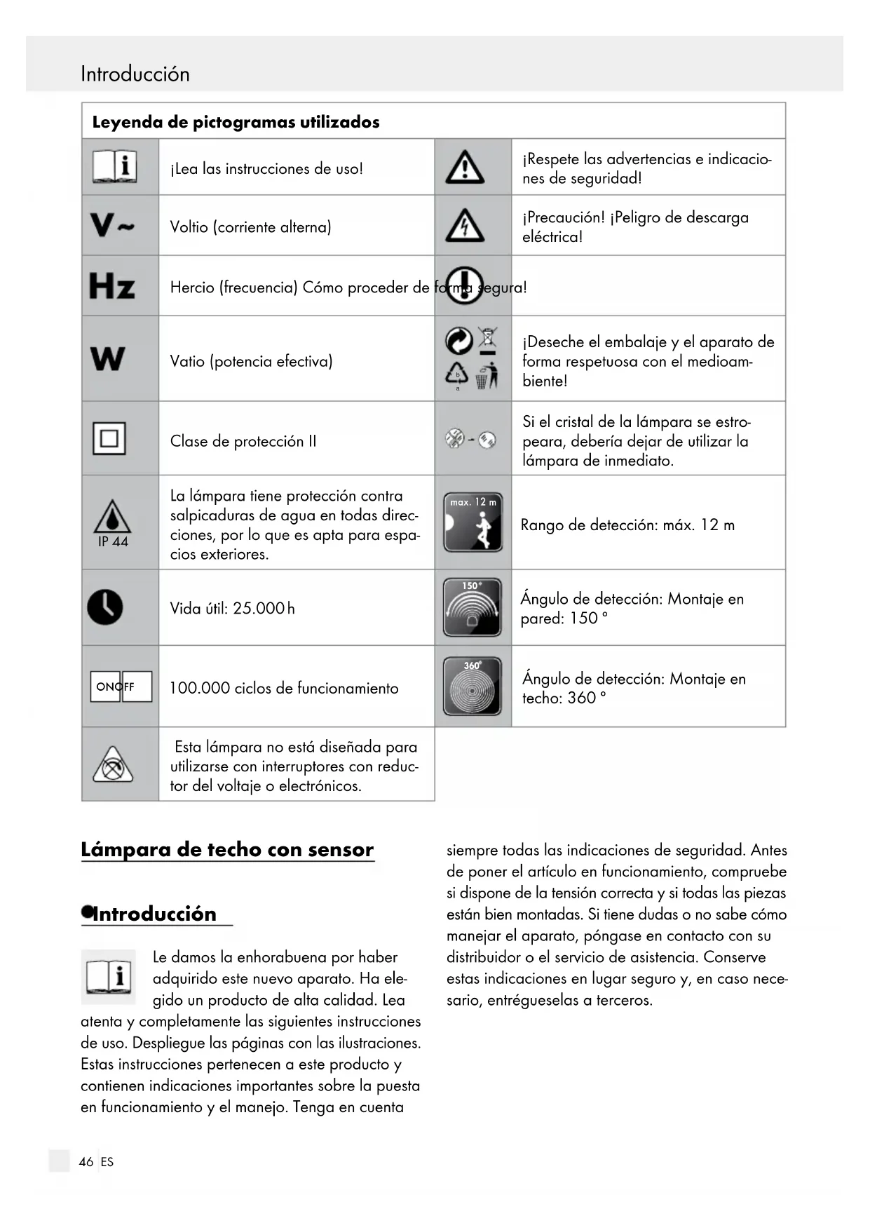 Ángulo de detección: Montaje en techo: 360 ° Esta lámpara no está diseñada para utilizarse con interruptores con reduc- tor del voltaje o electrónicos. Lámpara de techo con sensor Introducción Le damos la enhorabuena por haber adquirido este nuevo aparato. Ha ele- gido un producto de alta calidad. Lea atenta y completamente las siguientes instrucciones de uso. Despliegue las páginas con las ilustraciones. Estas instrucciones pertenecen a este producto y contienen indicaciones importantes sobre la puesta en funcionamiento y el manejo. Tenga en cuenta siempre todas las indicaciones de seguridad. Antes de poner el artículo en funcionamiento, compruebe si dispone de la tensión correcta y si todas las piezas están bien montadas. Si tiene dudas o no sabe cómo manejar el aparato, póngase en contacto con su distribuidor o el servicio de asistencia. Conserve estas indicaciones en lugar seguro y, en caso nece- sario, entrégueselas a terceros. Introducción Introducción / Seguridad47 ES Uso adecuado Esta lámpara está diseñada para el funcionamiento en espacios interiores y exteriores. La lámpara puede montarse sobre todas las superficies inflamables normales. ¡El electricista cualificado que instale la lámpara tendrá que asegurarse de que esta no se instale sobre superficies húmedas o conductoras! Este aparato ha sido diseñado exclusivamente para uso doméstico. Contenido Compruebe siempre inmediatamente después de desembalar la integridad del contenido y el per- fecto estado del aparato. 1 Lámpara de techo con sensor 1 Bombilla LED (5,5 W, E27) (no regulable) Material de montaje (tacos y tornillos) 1 Manual de instrucciones Descripción de las piezas