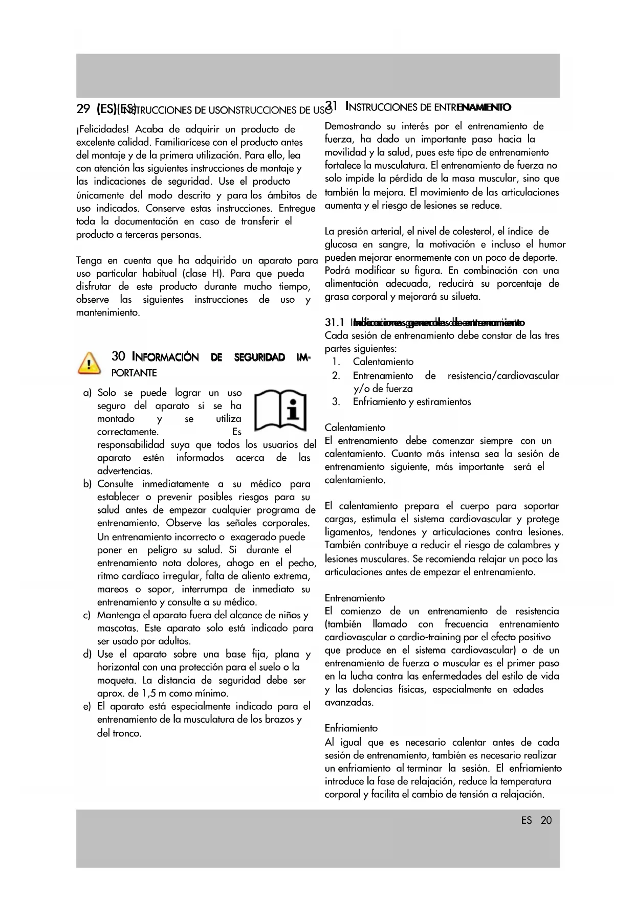 a) Solo se puede lograr un uso seguro del aparato si se ha montado y se utiliza correctamente. Es responsabilidad suya que todos los usuarios del aparato estén informados acerca de las advertencias. b) Consulte inmediatamente a su médico para establecer o prevenir posibles riesgos para su salud antes de empezar cualquier programa de entrenamiento. Observe las señales corporales. Un entrenamiento incorrecto o exagerado puede poner en peligro su salud. Si durante el entrenamiento nota dolores, ahogo en el pecho, ritmo cardíaco irregular, falta de aliento extrema, mareos o sopor, interrumpa de inmediato su entrenamiento y consulte a su médico. c) Mantenga el aparato fuera del alcance de niños y mascotas. Este aparato solo está indicado para ser usado por adultos. d) Use el aparato sobre una base fija, plana y horizontal con una protección para el suelo o la moqueta. La distancia de seguridad debe ser aprox. de 1,5 m como mínimo. e) El aparato está especialmente indicado para el entrenamiento de la musculatura de los brazos y del tronco.