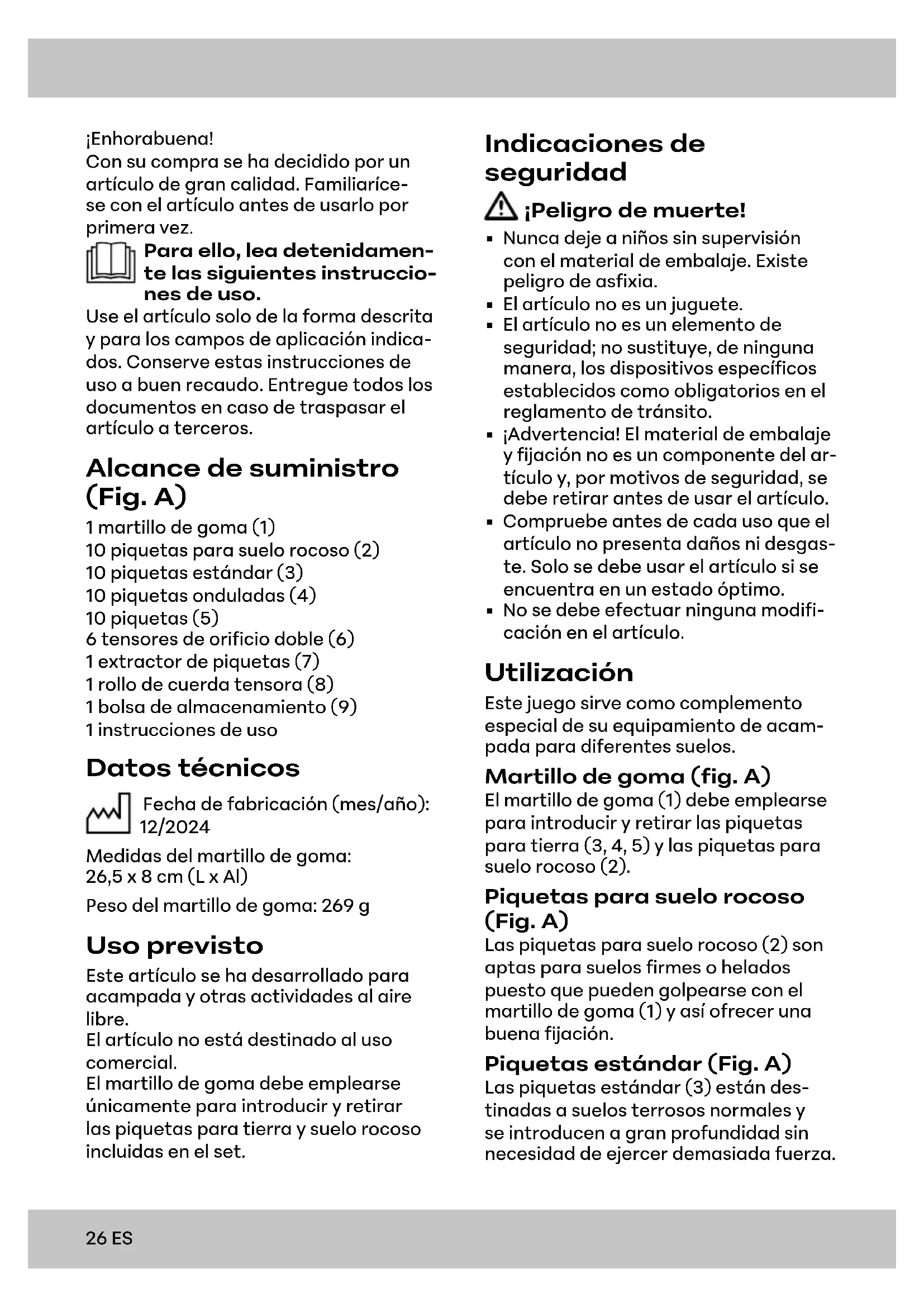 - No se debe efectuar ninguna modifi- cación en el artículo. Utilización Este juego sirve como complemento especial de su equipamiento de acam- pada para diferentes suelos. Martillo de goma (fig. A) El martillo de goma (1) debe emplearse para introducir y retirar las piquetas para tierra (3, 4, 5) y las piquetas para suelo rocoso (2). Piquetas para suelo rocoso (Fig.A) Las piquetas para suelo rocoso (2) son aptas para suelos firmes o helados puesto que pueden golpearse con el martillo de goma (1) y así ofrecer una buena fijación. Piquetas estándar (Fig.A) Las piquetas estándar (3) están des- tinadas a suelos terrosos normales y se introducen a gran profundidad sin necesidad de ejercer demasiada fuerza.27 Piquetas onduladas (Fig.A) Las piquetas onduladas (4) son espe- cialmente adecuadas para terrenos poco compactos debido a su longitud. Piquetas (Fig.A) Estas piquetas cortas (5) están desti- nadas a suelos arenosos caracteriza- dos por una gran densidad. Tensor de dos orificios y cuerda de amarre (fig. A) Para usar la cuerda de amarre (8), en- hébrela como se muestra en la fig. B en el tensor de dos orificios (6), anude un extremo y use el lazo que se ha forma- do para fijarla en el suelo. Almacenamiento, limpieza Deje que todos los componentes se sequen bien antes de volver a guardar el artículo. Esto previene la formación de moho y óxido, los olores y las decolo- raciones. Si no va a utilizarlo, almacene siempre el artículo seco y limpio y a temperatura ambiente. Si el artículo no se almacena adecuadamente, existe el riesgo de que se forme moho y óxido. Limpie solo con un paño de limpieza húmedo y después seque frotándolo. ¡IMPORTANTE! No lo limpie con produc- tos de limpieza agresivos. Indicaciones para la eliminación Elimine el artículo y los materiales de embalaje conforme a la correspondiente normativa local vigente. Guarde el material de embalaje (como, p. ej., las bolsas de plástico) fuera del alcance de los niños. En su administración local o municipal podrá obtener más información sobre la eliminación del artículo usado. Elimine el artículo y el embalaje de forma respe- tuosa con el medio ambiente. El código de reciclaje se emplea para señalizar los diferentes materiales para su retorno al ciclo de reciclaje. El código se compone de un símbolo de reciclaje para el ciclo de aprovechamiento y un número que señaliza el material. Indicaciones relativas a la garantía y la gestión de servicios El artículo ha sido fabricado con gran esmero y sometido a controles cons- tantes. Para el mismo, DELTA-SPORT HANDELSKONTOR GmbH ofrece a los clientes finales particulares una garantía de tres años a contar desde la fecha de compra (periodo de garantía) con arreglo a las condiciones que se exponen a continuación. La garantía tiene validez únicamente para fallos del material y fabricación. La garantía no cubre las piezas sometidas a un desgaste normal y se consideren por ello piezas de desgaste (p. ej., pilas) así como tampoco a piezas frágiles como interruptores o piezas fabricadas en vidrio o cristal. Se excluyen derechos derivados de esta garantía, si se ha realizado un uso incorrecto o abusivo del artículo o que no se encuentre dentro del marco del uso o ámbito de uso previstos o si no se ha observado lo recogido en el manual de instrucciones, a no ser que el cliente final demuestre que existen fallos del material o fabricación no derivados de una de las circunstancias expuestas anteriormente. ES28 ES Las demandas derivadas de la garan- tía sólo podrán presentarse dentro del periodo de garantía exhibiendo el comprobante de compra original. Le rogamos, por ello, que conserve el com- probante de compra original. El periodo de garantía no se verá prolongado por ningún tipo de reparación realizada con motivo de la garantía, la garantía legal o como gesto de buena voluntad. Esto se aplica también a las piezas sustitui- das o reparadas. Por favor, dirija sus quejas primero a la línea telefónica del servicio de atención al cliente que se indica a continuación o póngase en contacto con nosotros por correo electrónico. Si el caso está cubierto por la garantía, a nuestra elec- ción, repararemos o cambiaremos gra- tuitamente el artículo o le restituiremos el precio de compra del mismo. De la garantía no se derivan otros derechos. Esta garantía no limitará sus derechos legales, especialmente los derechos de garantía frente al vendedor correspon- diente. IAN: 470672_2407 Servicio España Tel.: 900 984 989 E-Mail: deltasport@lidl.es29DK Hjertelig tillykke! Du har valgt at købe et kvalitetspro- dukt. Lær produktet at kende, inden du bruger det første gang. Det gør du ved at læse nedenstående brugervej- ledning omhyggeligt. Brug kun produktet som beskrevet og til de angivne anvendelsesområder. Opbevar denne brugervejledning et sikkert sted. Udlever også alle doku- menter, hvis produktet videregives til en tredjepart. Leveringsomfang (fig.A) 1xgummihammer (1) 10xpløk til klippegrund (2) 10xstandardpløk (3) 10xbølget pløk (4) 10xpløk (5) 6xtohuls bardunstrammer (6) 1xpløkoptager (7) 1xbardun (8) 1xopbevaringstaske (9) 1xbrugervejledning 1 x kort vejledning Tekniske data Fremstillingsdato (måned/år): 12/2024 Mål, gummihammer: 26,5 x 8 cm (L x H) Vægt, gummihammer: 269 g Bestemmelsesmæssig brug Denne artikel er udviklet til camping og andre udendørsaktiviteter. Artiklen er ikke beregnet til erhvervs- mæssig brug. Gummihammeren skal kun bruges til at indslå og fjerne de jord- og klippe- bundspløkker, der er i sættet. Sikkerhedsanvisninger Livsfare!