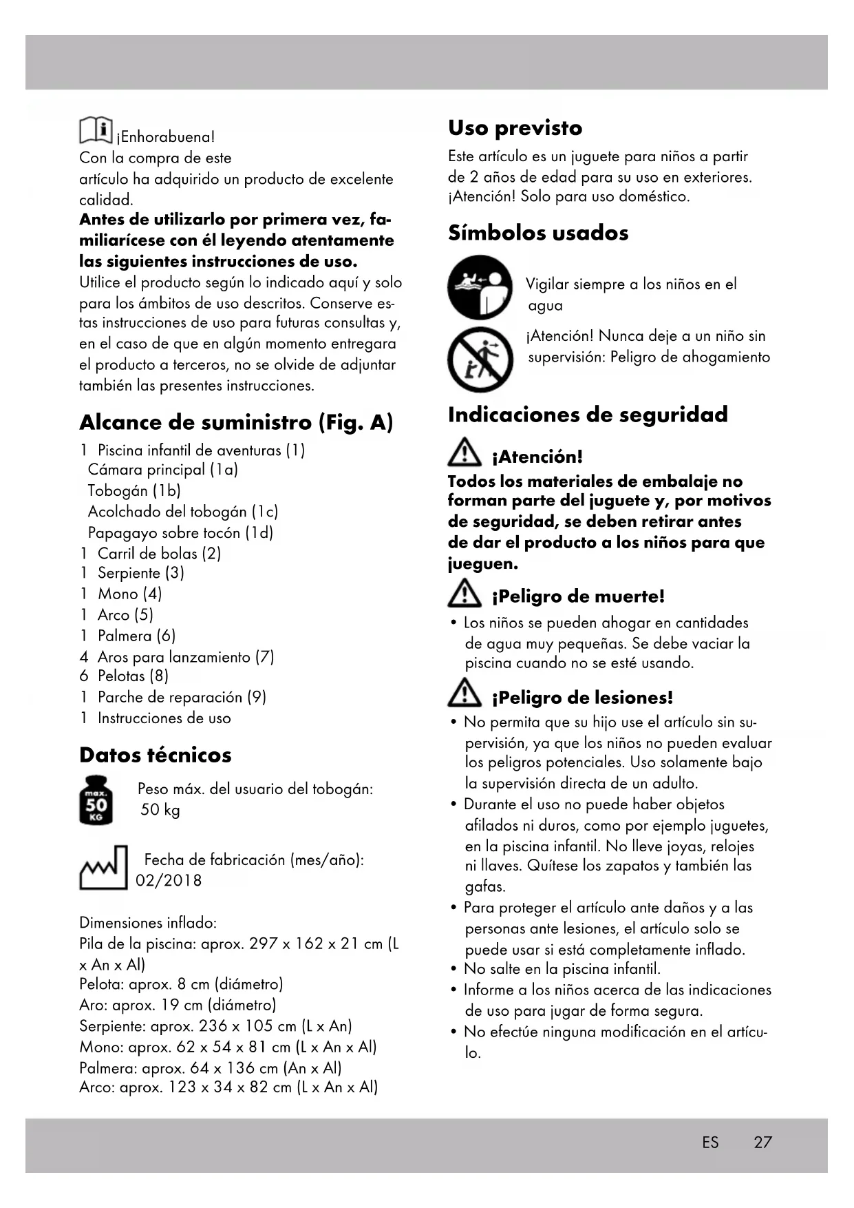 Připojte zahradní hadici s vnitřním průměrem 13–15 mm (1/2 – 5/8 palců) k přívodu vody do výrobku (obr. D). Doporučujeme pro jednoduchou montáž použití hadicové spojky 13–15 mm (1/2 – 5/8 palců). Naplnění výrobku vodou Naplňte výrobek pomalu a nenechávejte výro- bek během naplňování bez dozoru. Naplňte výrobek jen k zobrazenému značení. Důležité! Dbejte na plnící množství 300 l bez připojené sprchy ve tvaru hada! Vyprázdnění výrobku Otevřete výpustné ventily a nechejte vodu odtéct (obr. E). Poznámka: Prosím, dbejte na místní ustanovení a speciální předpisy k od- stranění vody z bazénu.26 Průběh služby IAN: 298445 Servis Česko Tel.: 800143873 E-Mail: deltasport@lidl.cz CZ27 ¡Enhorabuena! Con la compra de este artículo ha adquirido un producto de excelente calidad. Antes de utilizarlo por primera vez, fa- miliarícese con él leyendo atentamente las siguientes instrucciones de uso. Utilice el producto según lo indicado aquí y solo para los ámbitos de uso descritos. Conserve es- tas instrucciones de uso para futuras consultas y, en el caso de que en algún momento entregara el producto a terceros, no se olvide de adjuntar también las presentes instrucciones. Alcance de suministro (Fig. A) 1 Piscina infantil de aventuras (1) Cámara principal (1a) Tobogán (1b) Acolchado del tobogán (1c) Papagayo sobre tocón (1d) 1 Carril de bolas (2) 1 Serpiente (3) 1 Mono (4) 1 Arco (5) 1 Palmera (6) 4 Aros para lanzamiento (7) 6 Pelotas (8) 1 Parche de reparación (9) 1 Instrucciones de uso Datos técnicos Peso máx. del usuario del tobogán: 50 kg Fecha de fabricación (mes/año): 02/2018 Dimensiones inflado: Pila de la piscina: aprox. 297 x 162 x 21 cm (L x An x Al) Pelota: aprox. 8 cm (diámetro) Aro: aprox. 19 cm (diámetro) Serpiente: aprox. 236 x 105 cm (L x An) Mono: aprox. 62 x 54 x 81 cm (L x An x Al) Palmera: aprox. 64 x 136 cm (An x Al) Arco: aprox. 123 x 34 x 82 cm (L x An x Al) Uso previsto Este artículo es un juguete para niños a partir de 2 años de edad para su uso en exteriores. ¡Atención! Solo para uso doméstico. Símbolos usados Vigilar siempre a los niños en el agua ¡Atención! Nunca deje a un niño sin supervisión: Peligro de ahogamiento Indicaciones de seguridad ¡Atención! Todos los materiales de embalaje no forman parte del juguete y, por motivos de seguridad, se deben retirar antes de dar el producto a los niños para que jueguen. ¡Peligro de muerte!