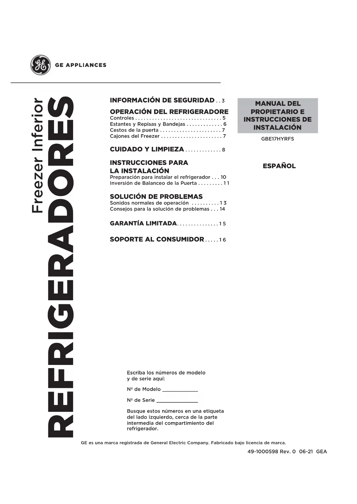 Escriba los números de modelo y de serie aquí: Nº de Modelo ____________ Nº de Serie ______________ Busque estos números en una etiqueta del lado izquierdo, cerca de la parte intermedia del compartimiento del refrigerador. GE es una marca registrada de General Electric Company. Fabricado bajo licencia de marca.2 49-1000598 Rev. 0 GRACIAS POR HACER QUE GE APPLIANCES SEA PARTE DE SU HOGAR. Ya sea que haya crecido usando GE Appliances, o que ésta es su primera vez, nos complace tenerlo en la familia. Sentimos orgullo por el nivel de arte, innovación y diseño de cada uno de los electrodomésticos de GE Appliances, y creemos que usted también. Entre otras cosas, el registro de su electrodoméstico asegura que podamos entregarle información importante del producto y detalles de la garantía cuando los necesite. Registre su electrodoméstico GE ahora a través de Internet. Sitios Web y números telefónicos útiles están disponibles en la sección de Soporte para el Consumidor de este Manual del Propietario. También puede enviar una carta en la tarjeta de inscripción preimpresa que se incluye con el material embalado.49-1000598 Rev. 0 3