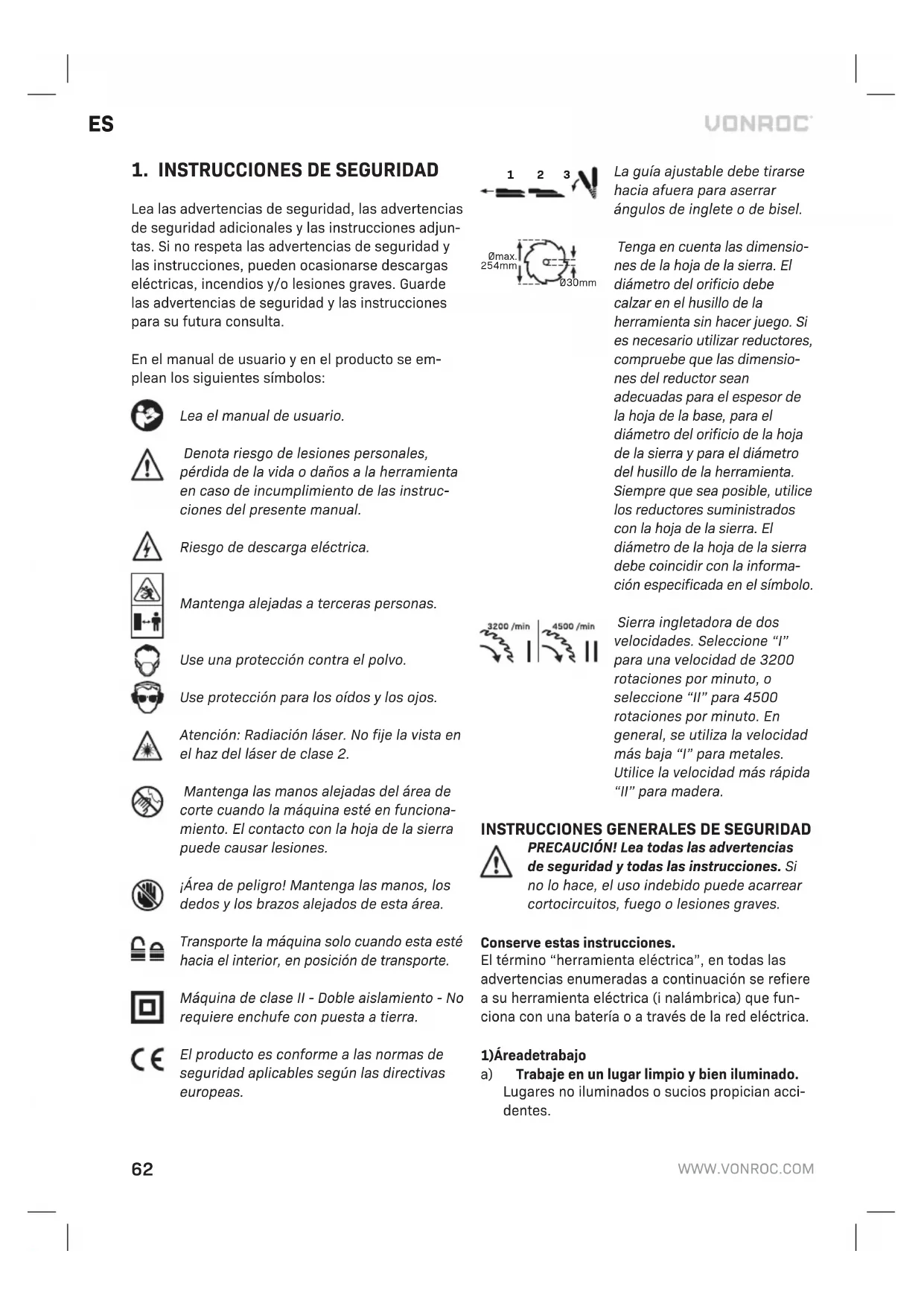 La guía ajustable debe tirarse hacia afuera para aserrar ángulos de inglete o de bisel. Ø30mm Ømax. 254mm Tenga en cuenta las dimensio- nes de la hoja de la sierra. El diámetro del orificio debe calzar en el husillo de la herramienta sin hacer juego. Si es necesario utilizar reductores, compruebe que las dimensio- nes del reductor sean adecuadas para el espesor de la hoja de la base, para el diámetro del orificio de la hoja de la sierra y para el diámetro del husillo de la herramienta. Siempre que sea posible, utilice los reductores suministrados con la hoja de la sierra. El diámetro de la hoja de la sierra debe coincidir con la informa- ción especificada en el símbolo. Sierra ingletadora de dos velocidades. Seleccione “I” para una velocidad de 3200 rotaciones por minuto, o seleccione “II” para 4500 rotaciones por minuto. En general, se utiliza la velocidad más baja “I” para metales. Utilice la velocidad más rápida “II” para madera.