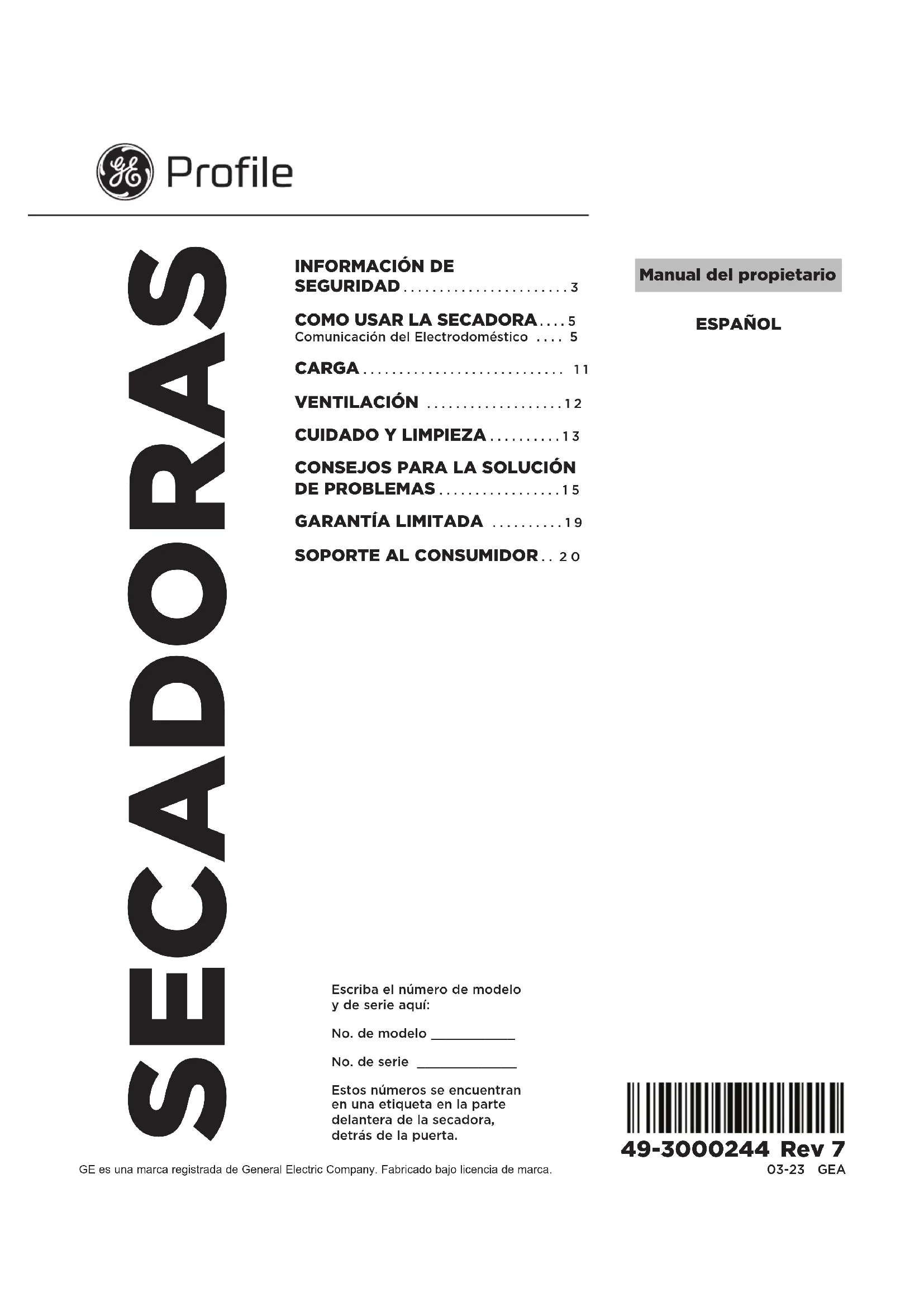 ESPAÑOL Manual del propietario Escriba el número de modelo y de serie aquí: No. de modelo ___________ No. de serie _____________ Estos números se encuentran en una etiqueta en la parte delantera de la secadora, detrás de la puerta. SECADORAS 49-3000244 Rev 7 03-23 GEA2 49-3000244 Rev 7 GRACIAS POR HACER QUE GE APPLIANCES SEA PARTE DE SU HOGAR. Ya sea que haya crecido usando GE Appliances, o que esta sea su primera vez, nos complace tenerlo en la familia. Nos enorgullecemos de la calidad en los detalles, la innovación y el diseño que se incluyen en todos los GE Appliances, y creemos que usted también lo hará. Entre otras cosas, el registro de su electrodoméstico asegura que podamos entregarle información importante del producto y detalles de la garantía cuando los necesite. Registre su electrodoméstico GE ahora a través de Internet. Sitios Web y números telefónicos útiles están disponibles en la sección de Soporte para el Consumidor de este Manual del Propietario. También puede enviar por correo la tarjeta de registro preimpresa incluida en el empaque.49-3000244 Rev 7 3