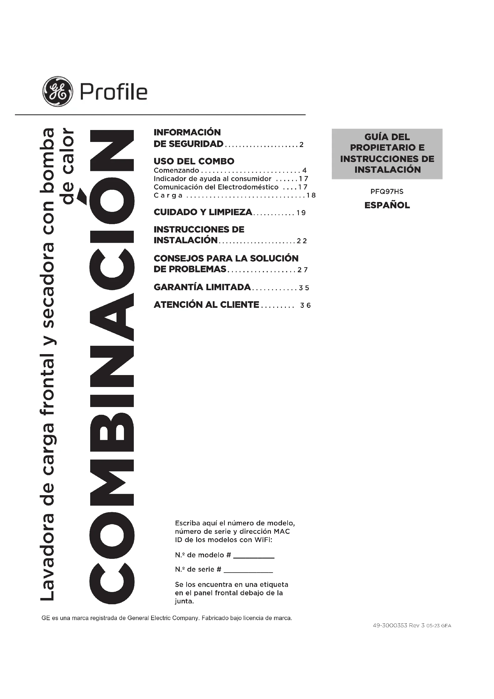 Burlington, ON L7L 6C7 electromenagersge.ca/contactez-nous ou composer le 877.994.5366GUÍA DEL PROPIETARIO E INSTRUCCIONES DE INSTALACIÓN GE es una marca registrada de General Electric Company. Fabricado bajo licencia de marca. ESPAÑOL PFQ97HS 49-3000353 Rev 3 05-23 GEA COMBINACIÓN Lavadora de carga frontal y secadora con bomba de calor Escriba aquí el número de modelo, número de serie y dirección MAC ID de los modelos con WiFi: N.º de modelo # __________ N.º de serie # ____________ Se los encuentra en una etiqueta en el panel frontal debajo de la junta. INFORMACIÓN DE SEGURIDAD .....................2