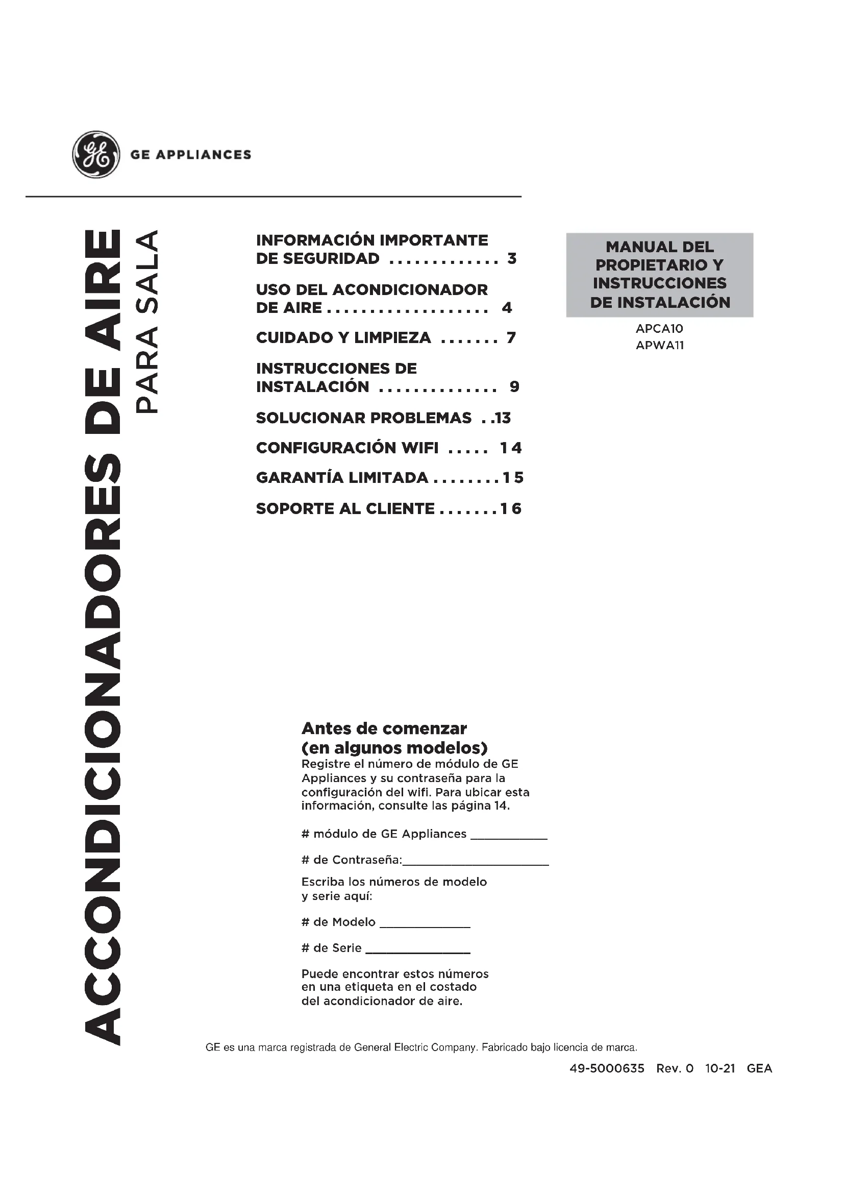 Descarga las instrucciones para tu Aire acondicionado en formato PDF gratis! Encuentra tus instrucciones APWA11YBBW - GE y toma tu dispositivo electrónico nuevamente en la mano. En esta página están publicados todos los documentos necesarios para el uso de su dispositivo. APWA11YBBW de la marca GE.
