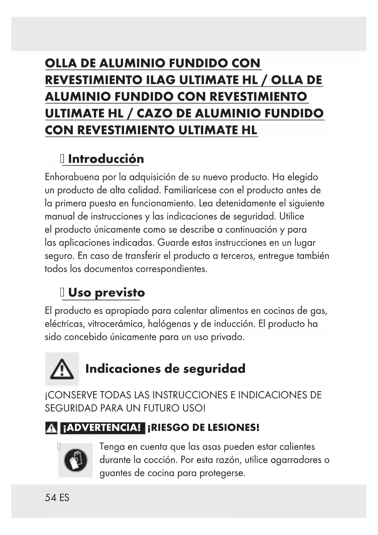 Instrucciones de utilización y de seguridad GRYDE AF STØBT ALUMINIUM MED ILAG ULTIMATE HL-BELÆGNING/ GRYDE AF STØBT ALUMINIUM