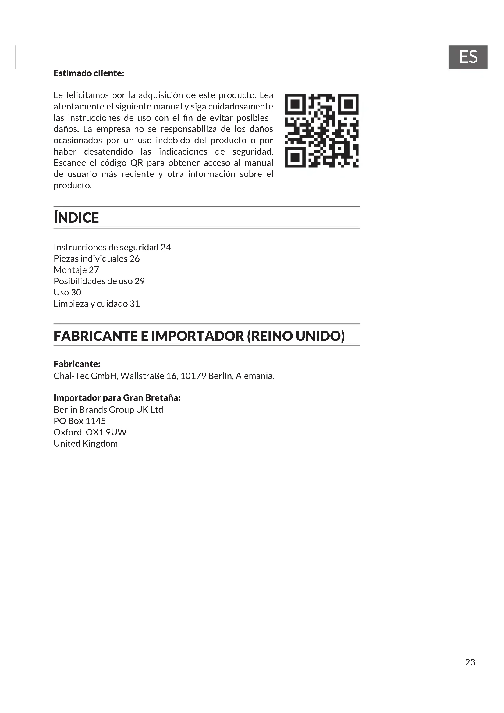 Estimado cliente: Le felicitamos por la adquisición de este producto. Lea atentamente el siguiente manual y siga cuidadosamente las instrucciones de uso con el n de evitar posibles daños. La empresa no se responsabiliza de los daños ocasionados por un uso indebido del producto o por haber desatendido las indicaciones de seguridad. Escanee el código QR para obtener acceso al manual de usuario más reciente y otra información sobre el producto. ÍNDICE Instrucciones de seguridad 24 Piezas individuales 26 Montaje 27 Posibilidades de uso 29 Uso 30 Limpieza y cuidado 31 FABRICANTE E IMPORTADOR (REINO UNIDO) Fabricante: Chal-Tec GmbH, Wallstraße 16, 10179 Berlín, Alemania. Importador para Gran Bretaña: Berlin Brands Group UK Ltd PO Box 1145 Oxford, OX1 9UW United Kingdom24