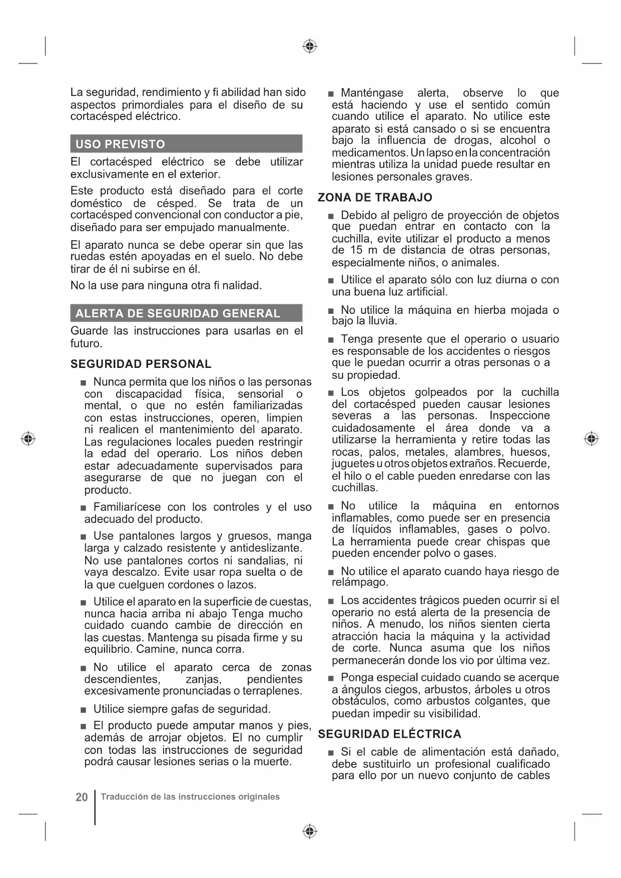 BEDIENUNGSANLEITUNG Anschließen an das Stromnetz Trennen vom Stromnetz Teile oder Zubehör getrennt erhältlich Hinweis Warnung Das Produkt anhalten.20 Traducción de las instrucciones originales La seguridad, rendimiento y fi abilidad han sido aspectos primordiales para el diseño de su cortacésped eléctrico. USO PREVISTO El cortacésped eléctrico se debe utilizar exclusivamente en el exterior. Este producto está diseñado para el corte doméstico de césped. Se trata de un cortacésped convencional con conductor a pie, diseñado para ser empujado manualmente. El aparato nunca se debe operar sin que las ruedas estén apoyadas en el suelo. No debe tirar de él ni subirse en él. No la use para ninguna otra fi nalidad.