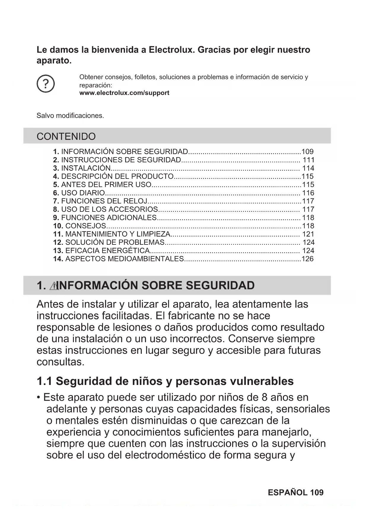 - Este aparato puede ser utilizado por niños de 8 años en adelante y personas cuyas capacidades físicas, sensoriales o mentales estén disminuidas o que carezcan de la experiencia y conocimientos suficientes para manejarlo, siempre que cuenten con las instrucciones o la supervisión sobre el uso del electrodoméstico de forma segura y ESPAÑOL 109comprendan los riesgos. Es necesario mantener alejados del aparato a los niños de menos de 8 años, así como a las personas con minusvalías importantes y complejas, salvo que estén bajo supervisión continua.