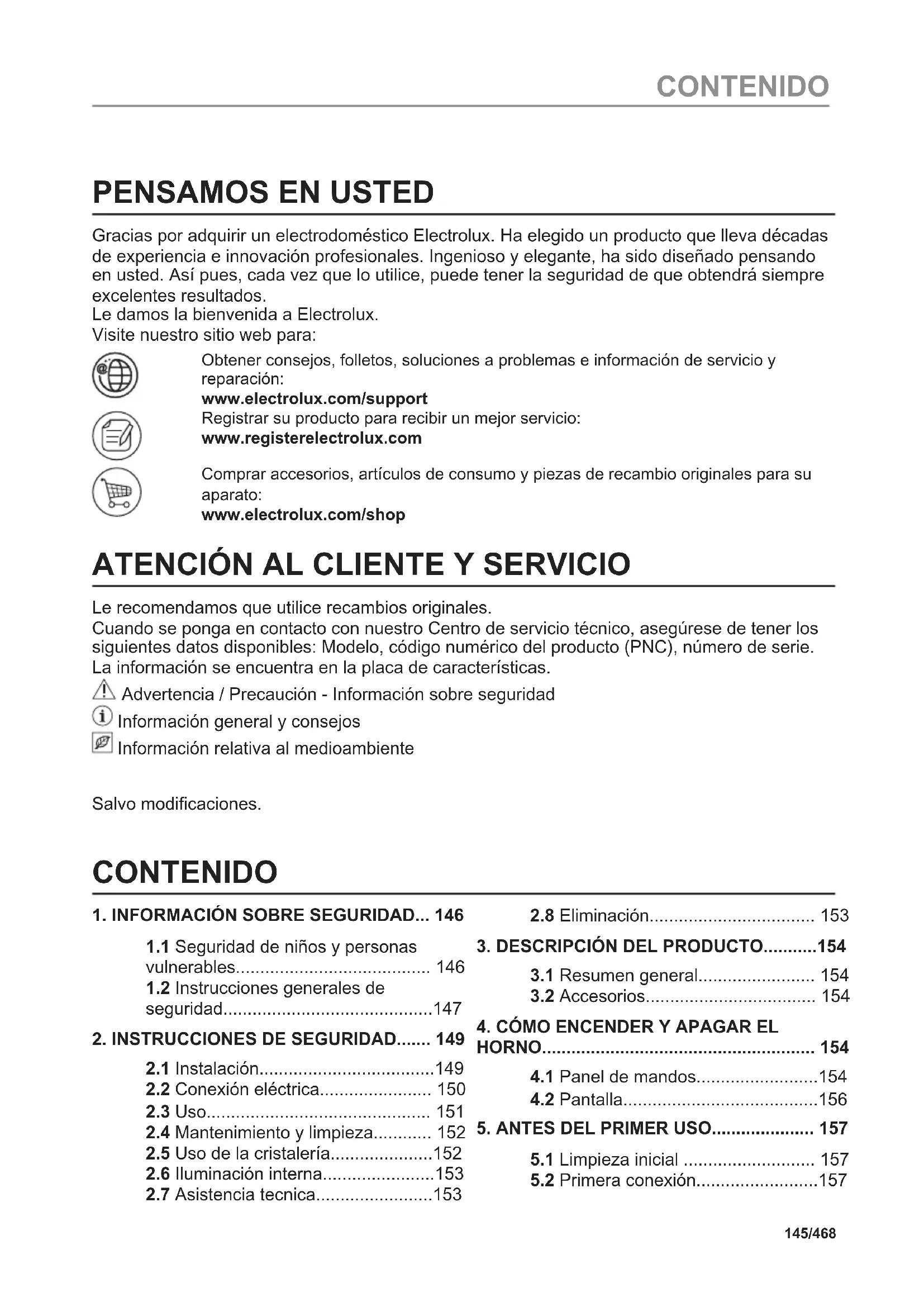 Gracias por adquirir un electrodoméstico Electrolux. Ha elegido un producto que lleva décadas de experiencia e innovación profesionales. Ingenioso y elegante, ha sido diseñado pensando en usted. Así pues, cada vez que lo utilice, puede tener la seguridad de que obtendrá siempre excelentes resultados. Le damos la bienvenida a Electrolux. Visite nuestro sitio web para: Obtener consejos, folletos, soluciones a problemas e información de servicio y reparación: www.electrolux.com/support Registrar su producto para recibir un mejor servicio: www.registerelectrolux.com Comprar accesorios, artículos de consumo y piezas de recambio originales para su aparato: www.electrolux.com/shop